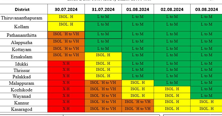 ഒറ്റപ്പെട്ട സ്ഥലങ്ങളിൽ ഇന്ന് (ജൂലൈ 30) അതി തീവ്ര മഴക്കും ജൂലൈ 30 മുതൽ ഓഗസ്റ്റ് 01 വരെ അതിശക്തമായ മഴക്കും; ജൂലൈ 30 മുതൽ ആഗസ്റ്റ് 03 വരെ ശക്തമായ മഴക്കും സാധ്യതയെന്ന് കേന്ദ്ര കാലാവസ്ഥ വകുപ്പ് അറിയിക്കുന്നു.
