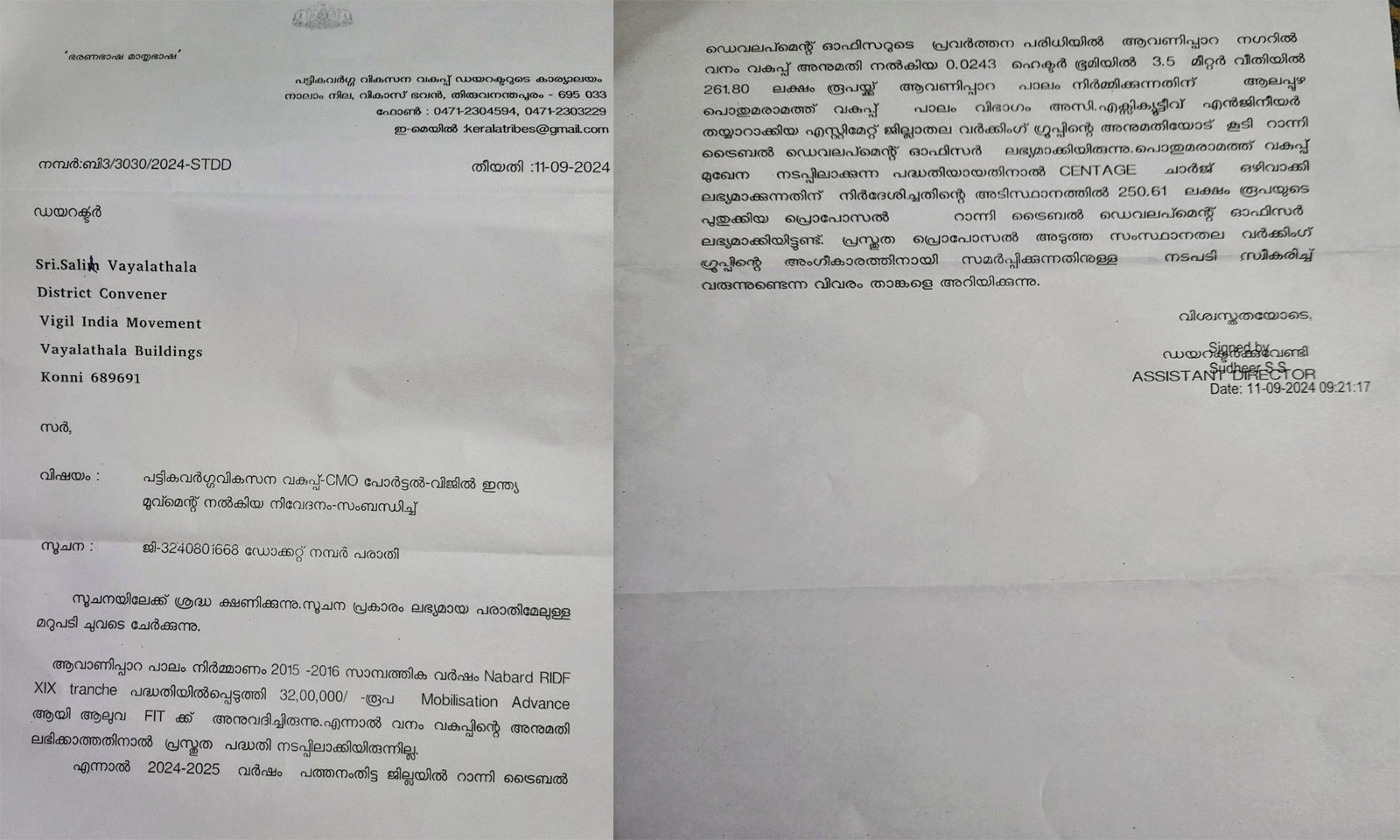 2024-25 വര്ഷം പത്തനംതിട്ട റാന്നി ട്രൈബല് ഡെവലപ്പ്മെന്റ് ഓഫീസറുടെ പ്രവര്ത്തന പരിധിയില് ആവണിപ്പാറ നഗറില് വനം വകുപ്പ് അനുമതി നല്കിയ 0.0243ഹെക്ടര് ഭൂമിയില് 3.5 മീറ്റര് വീതിയില് 261.80 ലക്ഷം രൂപയ്ക്ക് ആലപ്പുഴ പൊതുമരാമത്ത് വകുപ്പ് പാലം വിഭാഗം തയാറാക്കിയ പദ്ധതി ജില്ലാതല വര്ക്കിംഗ് ഗ്രൂപ്പിന്റെ അനുമതിയോട് കൂടി റാന്നി ട്രൈബല് ഓഫീസര് ലഭ്യമാക്കിയിരുന്നു .
