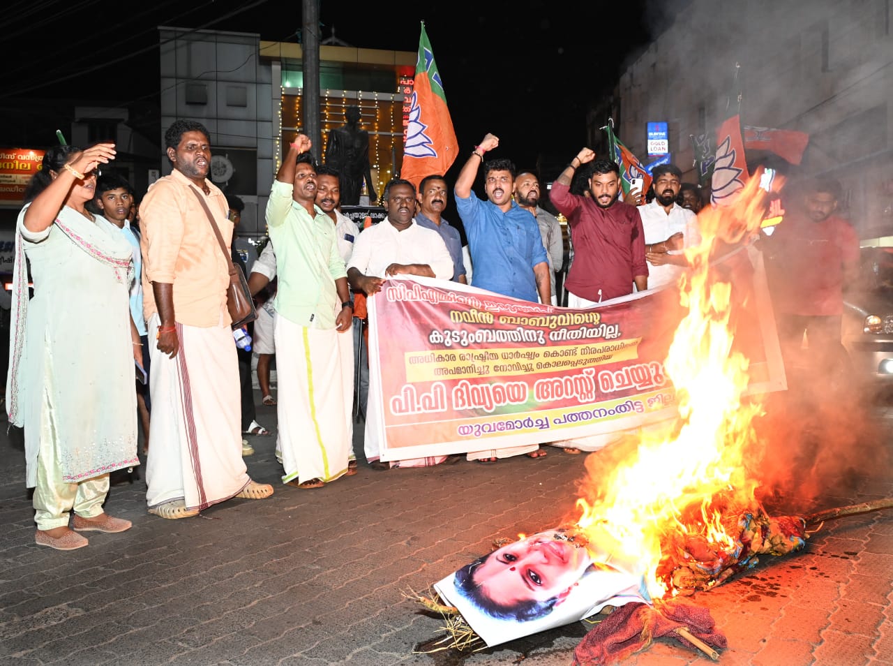 konnivartha.com/ പത്തനംതിട്ട : എ ഡി എം നവീൻ ബാബുവിനെ ആത്മഹത്യയിലേക്ക് നയിച്ച പി പി ദിവ്യയെ അറസ്റ്റ് ചെയ്യണമെന്ന് ആവശ്യപ്പെട്ട് യുവമോർച്ച പത്തനംതിട്ടയിൽ പ്രതിഷേധപ്രകടനവും പി പി ദിവ്യയുടെ കോലം കത്തിക്കലും നടത്തി.