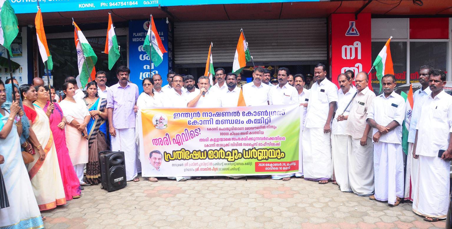 സാധാരണക്കാരന് വാതിൽപടി സംവിധാനത്തിൽ ലഭിക്കേണ്ട 80000 കിലോ അരി കോന്നി താലൂക്ക് ഭക്ഷ്യപൊതു വിതരണ ശേഖരണ കേന്ദ്രത്തിൽ നിന്നും കാണാതായ സംഭവത്തിൽ കുറ്റക്കാരെ സസ്പെൻ്റ് ചെയ്ത് നിയമത്തിന് മുമ്പിൽ കൊണ്ടുവരണമെന്ന ആവശ്യവുമായി കോൺഗ്രസ് മണ്ഡലം കമ്മിറ്റിയുടെ നേതൃത്വത്തിൽ താലൂക്ക് സിവിൽ സപ്ലൈസ് ഓഫീസിലേക്ക് നടത്തിയ പ്രതിഷേധ പ്രകടനവും ധർണ്ണയും ഉദ്ഘാടനം ചെയ്ത് സംസാരിക്കുകയായിരുന്നു റോബിൻ പീറ്റർ .മണ്ഡലം പ്രസിഡൻ്റ് പ്രവീൺ പ്ലാവിളയിൽ അദ്ധ്യക്ഷത വഹിച്ചു.
