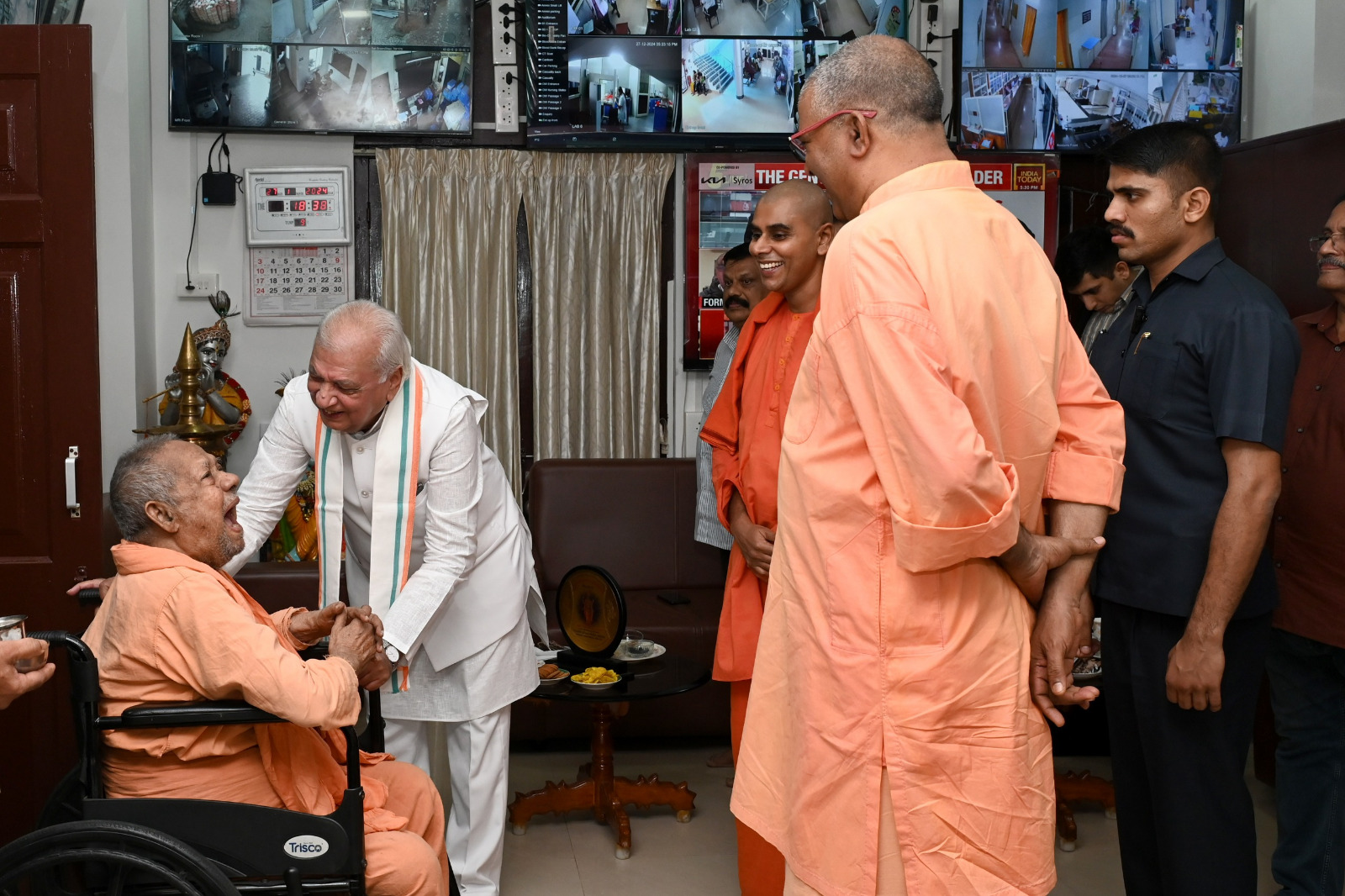 94 വയസ്സായ ഗോലോകാനന്ദ സ്വാമിയുടെ അടുത്തെത്തി കരം പിടിച്ച് അനുഗ്രഹം തേടി. വിശ്രമ ജീവിതം നയിക്കുന്ന ഗോലോകാനന്ദ സ്വാമി ഗവര്ണറുമായി ഹൃദയസ്പര്ശിയായ സംഭാഷണം നടത്തി. ആശ്രമം അധ്യക്ഷന് സ്വാമി മോക്ഷവ്രതാനന്ദയുമായി അരമണിക്കൂറോളം അദ്ദേഹം സംസാരിച്ചു.