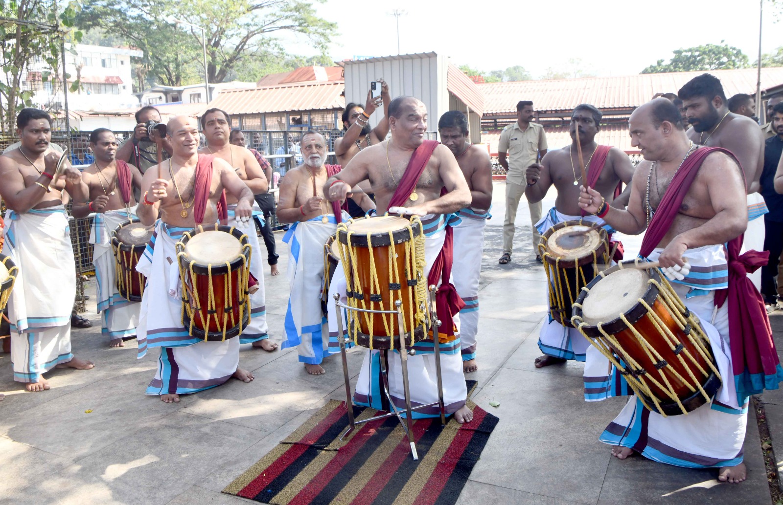 ചൊവ്വാഴ്ച രാത്രി മല കയറിയെത്തിയ സംഘം ബുധനാഴ്ച രാവിലെ എട്ടരയോടെയാണ് അയ്യപ്പ സന്നിധിയിൽ നാദ വിസ്മയം തീർത്തത്. മട്ടന്നൂർ ശങ്കരൻകുട്ടി മാരാരും മക്കളായ ശ്രീകാന്ത്, ശ്രീരാജ് എന്നിവരുമാണ് തായമ്പക നയിച്ചത്.