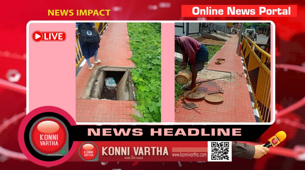 കോളേജ് സ്കൂൾ വിദ്യാർത്ഥികൾ ഉൾപ്പെടെ നൂറുകണക്കിന് കാൽ നട യാത്രകാർക്ക് അപകട ഭീഷണിയാണ് ഈ തകര്ന്ന സ്ലാബ് എന്ന് കോന്നി വാര്ത്ത റിപ്പോര്ട്ട് ചെയ്തതോടെ കോന്നി പഞ്ചായത്ത് അധ്യക്ഷ അനി സാബു ഉള്പ്പെടെ ഉള്ള ജനപ്രതിനിധികള് ബന്ധപ്പെട്ട വകുപ്പില് വിഷയം അവതരിപ്പിച്ചു . റോഡ് നിര്മ്മാണ ചുമതല ഉള്ള കമ്പനി തന്നെ നടപടി സ്വീകരിച്ചു . സ്ലാബ് പുന:സ്ഥാപിച്ചു എന്ന് കോന്നി പഞ്ചായത്ത് അധ്യക്ഷ അറിയിച്ചു .