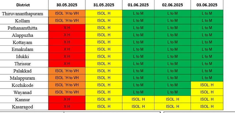 കേരളത്തിൽ ഒറ്റപ്പെട്ടയിടങ്ങളിൽ 31/05/2025, 01/06/2025 തീയതികളിൽ ഇടിമിന്നലോടുകൂടിയ മഴയ്ക്കും മണിക്കൂറിൽ 50 മുതൽ 60 കിലോമീറ്റർ വരെ വേഗതയിൽ ശക്തമായ കാറ്റിനും സാധ്യതയുണ്ടെന്ന് കേന്ദ്ര കാലാവസ്ഥാ വകുപ്പ് അറിയിച്ചു.