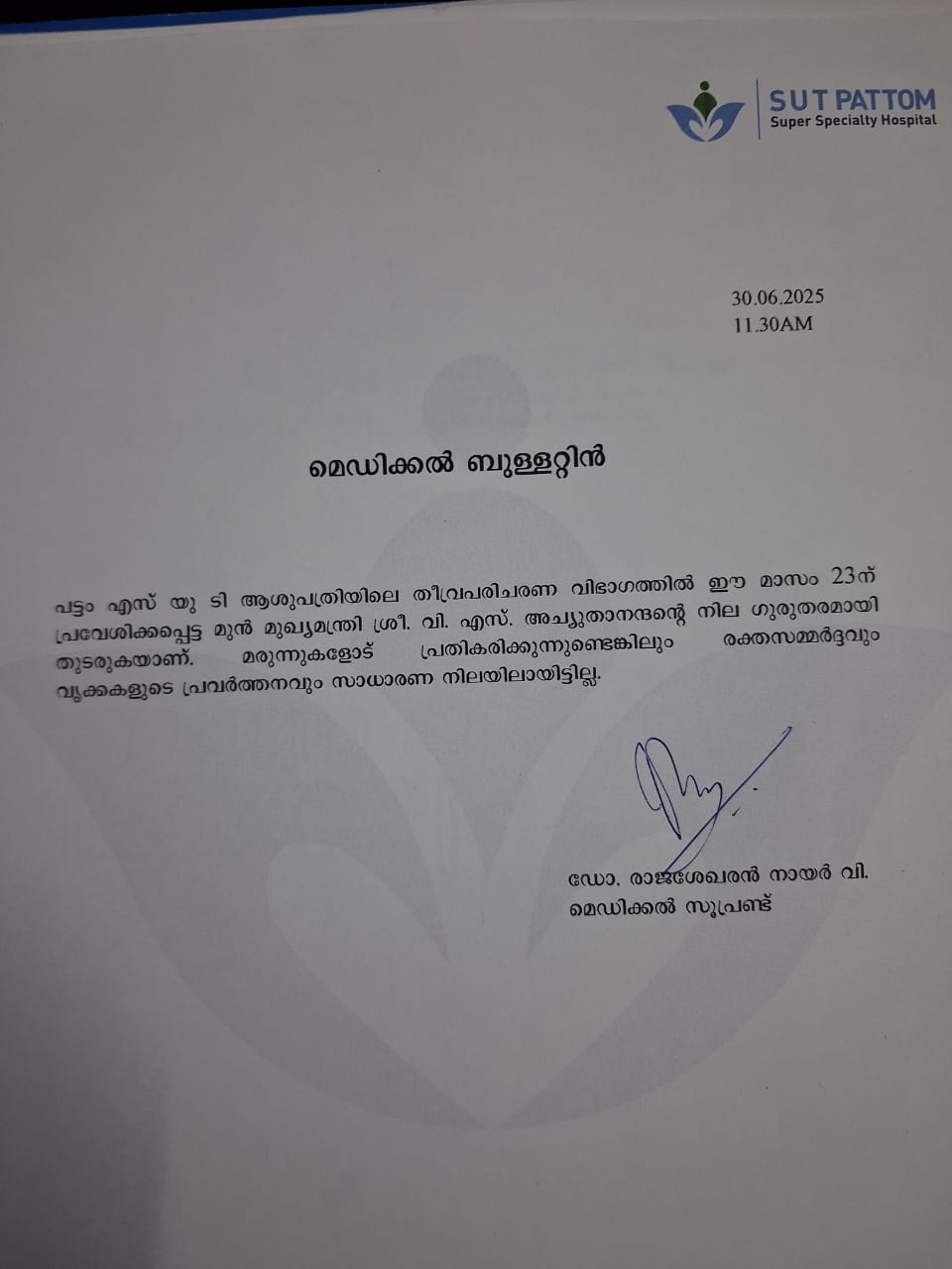 മുൻ മുഖ്യമന്ത്രി വി.എസ്. അച്യുതാനന്ദന്റെ ആരോഗ്യനില ഗുരുതരമായി തുടരുകയാണെന്ന് മെഡിക്കൽ ബുള്ളറ്റിൻ.മരുന്നുകളോട് പ്രതികരിക്കുന്നുണ്ടെങ്കിലും രക്തസമ്മർദവും വൃക്കകളുടെ പ്രവർത്തനവും സാധാരണനിലയിലായിട്ടില്ലെന്ന് ആശുപത്രി അധികൃതർ അറിയിച്ചു.
