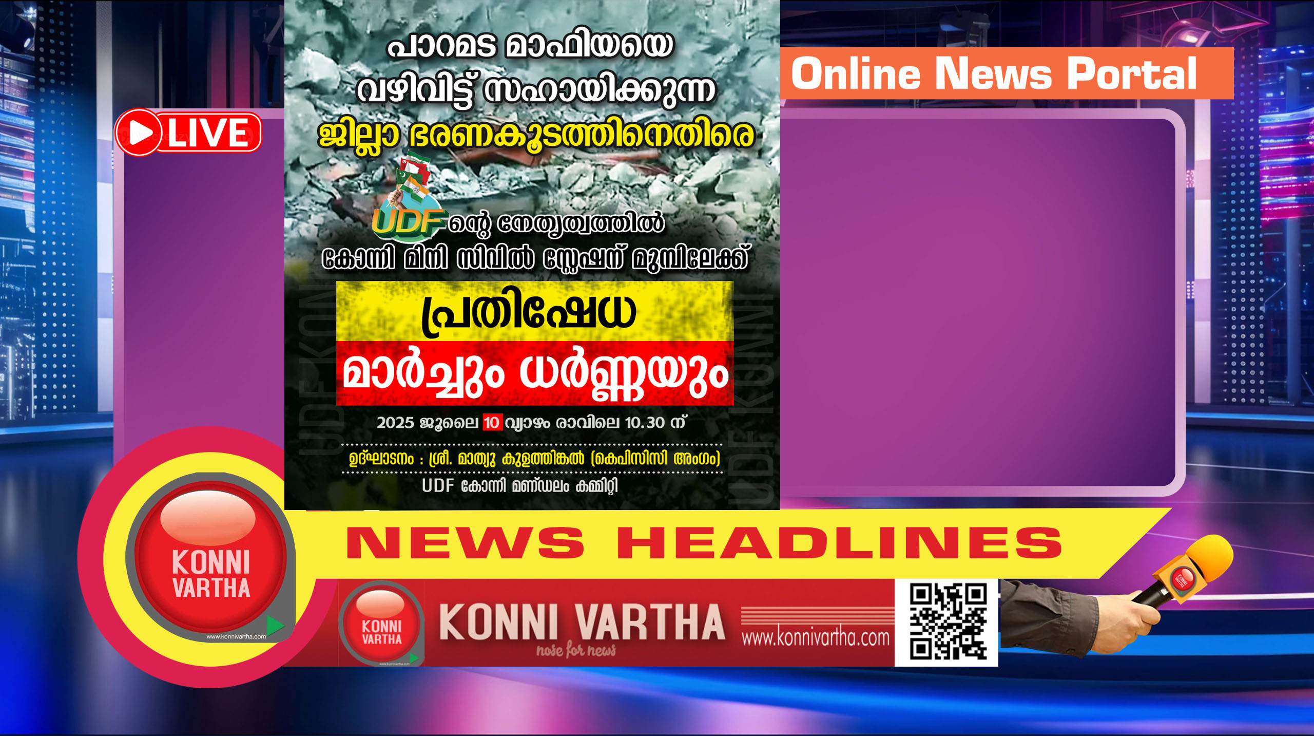 konnivartha.com: കോന്നി മേഖലയില് പാറമട മാഫിയായെ വഴിവിട്ടു സഹായിക്കുന്ന ജില്ലാ ഭരണകൂടത്തിന് എതിരെ യു ഡി എഫ് സമരം പ്രഖ്യാപിച്ചു . ജൂലൈ പത്തിന് രാവിലെ പത്തു മുപ്പതിന് യു ഡി എഫ് നേതൃത്വത്തില് കോന്നി മിനി സിവില് സ്റ്റേഷന് മുന്നിലേക്ക് മാര്ച്ചും ധര്ണ്ണയും നടക്കും .
