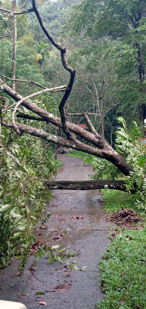 ഇന്നലെ വൈകിട്ട് അഞ്ചുമണിയോടുകൂടിയുള്ള മഴയിലും കാറ്റിലും ആണ് മരം നിലം പതിച്ചത്. ഇത് വരെ മരം മുറിച്ചു നീക്കിയിട്ടില്ലയിട്ടില്ല. സമീപം തന്നെ മറ്റൊരു മരവും അപകട സ്ഥിതിയിൽ ആണ്