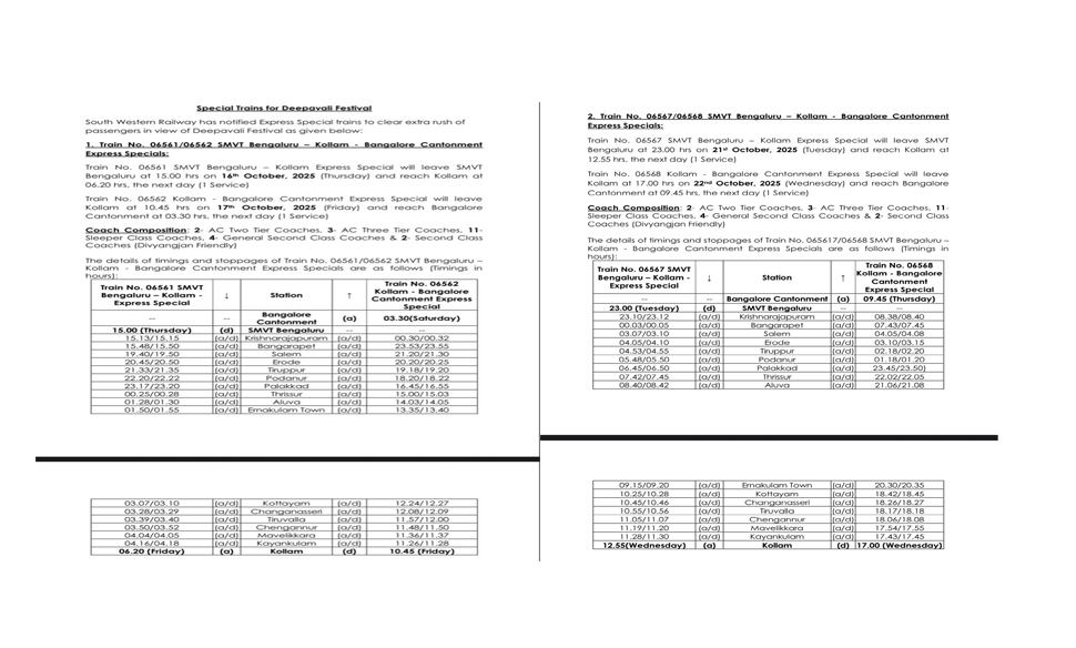 06561 എസ്എംവിടി ബെംഗളൂരു-കൊല്ലം സ്പെഷ്യല് എക്സ്പ്രസ് ഒക്ടോബര് 16-ന് വൈകീട്ട് മൂന്നുമണിക്ക് എസ്എംവിടി ബെംഗളൂരുവില്നിന്ന് പുറപ്പെടും. പിറ്റേദിവസം രാവിലെ 06.20-ന് കൊല്ലത്ത് എത്തിച്ചേരും.