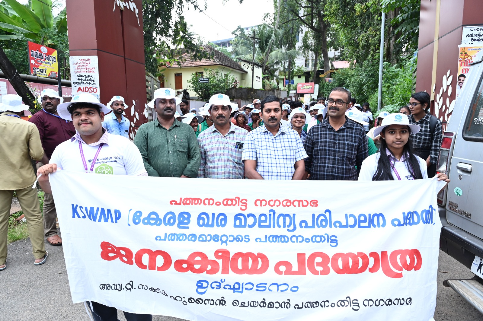 konnivartha.com: പത്തനംതിട്ട നഗരസഭയുടെയും കേരള ഖരമാലിന്യ പരിപാലന പദ്ധതിയുടെയും ആഭിമുഖ്യത്തില്‍ ‘പത്തരമാറ്റോടെ പത്തനംതിട്ട ‘ ജനകീയ ശുചിത്വപദയാത്ര സംഘടിപ്പിച്ചു . ശാസ്ത്രീയ മാലിന്യസംസ്‌കരണത്തിന്റെ പ്രാധാന്യം ജനമനസുകളിലേക്ക് എത്തിക്കുന്നതിനായുള്ള പദയാത്ര നഗരസഭാ ആരോഗ്യ സ്ഥിരം കാര്യസമിതി അധ്യക്ഷന്‍  ജെറി അലക്‌സ് , കലക്ടറേറ്റ് ഹുസൂര്‍ ശിരസ്തദാര്‍  വര്‍ഗീസ് മാത്യു എന്നിവര്‍ ചേര്‍ന്ന് ഫ്‌ളാഗ് ഓഫ് ചെയ്തു.