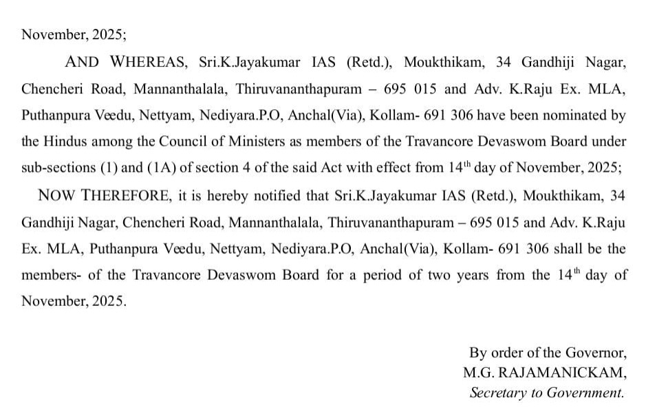konnivartha.com; തിരുവിതാംകൂര് ദേവസ്വം ബോര്ഡ് പ്രസിഡന്റായി മുന് ചീഫ് സെക്രട്ടറിയും മുന് ഐഎഎസ് ഉദ്യോഗസ്ഥനുമായ കെ. ജയകുമാറിനെ നിയമിച്ച് സംസ്ഥാന സര്ക്കാര് ഉത്തരവിറക്കി. നവംബര് 14 വെള്ളിയാഴ്ച മുതല് ഉത്തരവ് പ്രാബല്യത്തില് വരും .