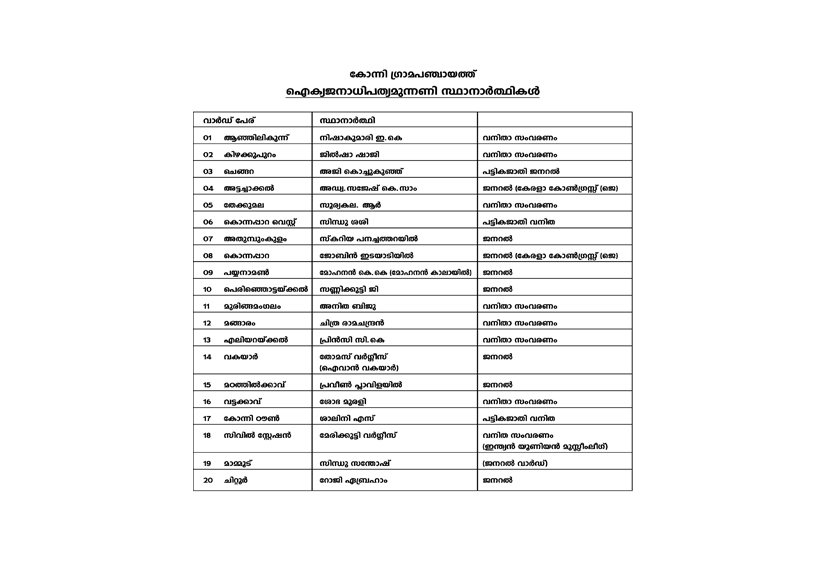 konnivartha.com; കോന്നി ഗ്രാമപഞ്ചായത്തിലെ 20 വാര്ഡുകളിലും മത്സരിക്കാന് ഉള്ള മുഴുവന് സ്ഥാനാർത്ഥികളെയും ഐക്യജനാധിപത്യമുന്നണി പ്രഖ്യാപിച്ചു വാർഡ് പേര് : സ്ഥാനാർത്ഥി 01 ആഞ്ഞിലികുന്ന് നിഷാകുമാരി ഇ.കെ വനിതാ സംവരണം 02 കിഴക്കുപുറം ജിൽഷാ ഷാജി വനിതാ സംവരണം 03 ചെങ്ങറ അജി കൊച്ചുകുഞ്ഞ് പട്ടികജാതി ജനറൽ 04 അട്ടച്ചാക്കൽ അഡ്വ. സജേഷ് കെ.സാം ജനറൽ (കേരളാ കോൺഗ്രസ്സ് (ജെ) 05 തേക്കുമല സൂര്യകല. ആർ വനിതാ സംവരണം 06 കൊന്നപ്പാറ വെസ്റ്റ് സിന്ധു ശശി പട്ടികജാതി വനിത 07 അതുമ്പുംകുളം സ്കറിയ പനച്ചത്തറയിൽ ജനറൽ 08 കൊന്നപ്പാറ ജോബിൻ ഇടയാടിയിൽ ജനറൽ (കേരളാ കോൺഗ്രസ്സ് (ജെ) 09 പയ്യനാമൺ മോഹനൻ കെ.കെ (മോഹനൻ കാലായിൽ) | ജനറൽ 10 പെരിഞ്ഞൊട്ടയ്ക്കൽ | സണ്ണിക്കുട്ടി ജി ജനറൽ 11 മുരിങ്ങമംഗലം അനിത ബിജു വനിതാ സംവരണം 12…