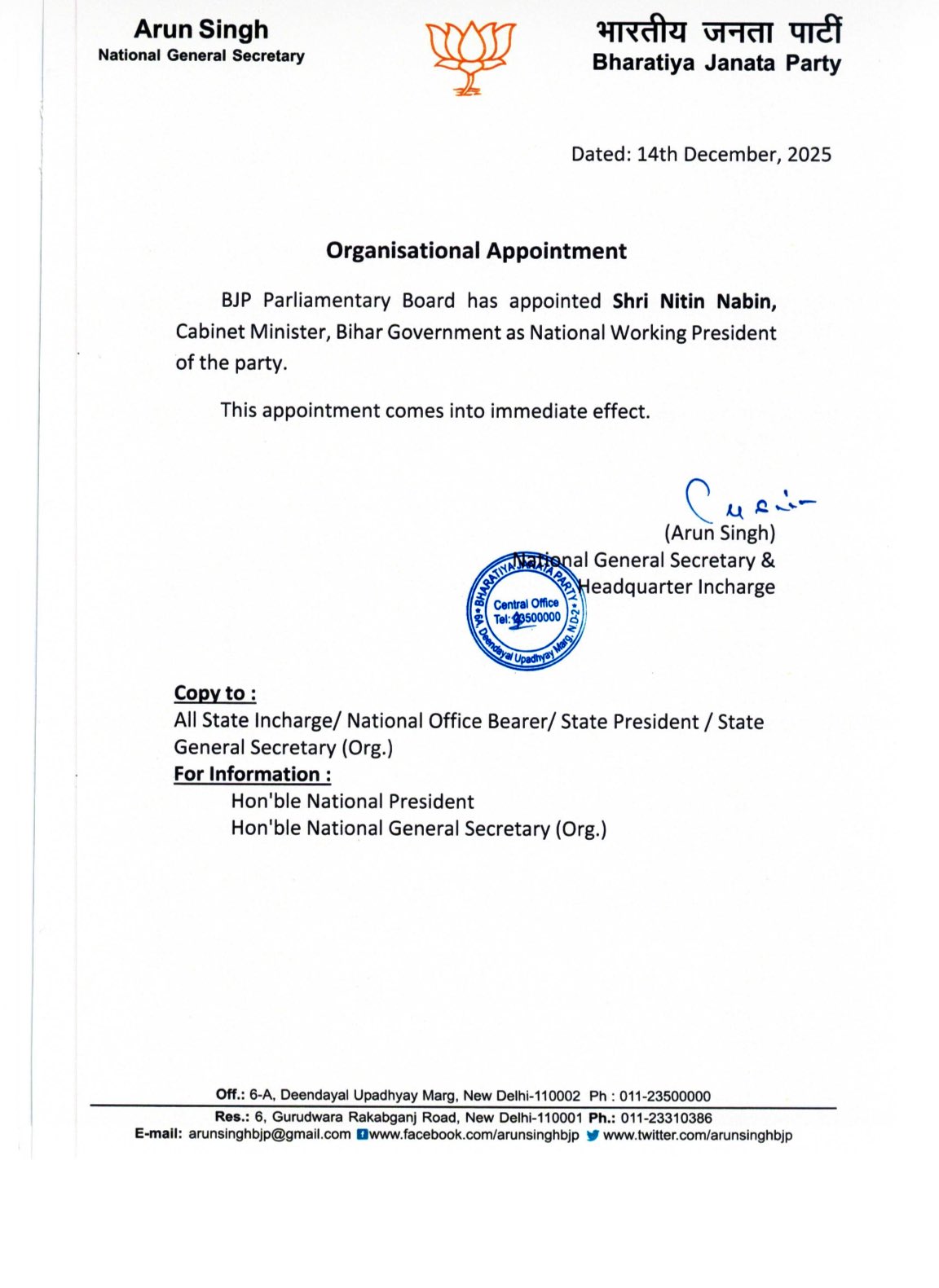 ബി ജെ പി പാര്ട്ടി പാര്ലമെന്ററി ബോര്ഡാണ് നിതിന് നബീനെ ദേശീയ വര്ക്കിങ് പ്രസിഡന്റ് സ്ഥാനത്തേക്ക് നിയമിച്ചത്.