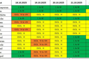 വിവിധ ജില്ലകളിൽ കേന്ദ്ര കാലാവസ്ഥ വകുപ്പ് ഓറഞ്ച്, മഞ്ഞ അലർട്ടുകൾ പ്രഖ്യാപിച്ചിരിക്കുന്നു. ഓറഞ്ച് അലർട്ട് 18/10/2025: പത്തനംതിട്ട, കോട്ടയം, ഇടുക്കി 19/10/2025: മലപ്പുറം, കോഴിക്കോട്, കണ്ണൂർ, കാസറഗോഡ് ജില്ലകളിൽ കേന്ദ്ര കാലാവസ്ഥ വകുപ്പ് ഓറഞ്ച് അലർട്ട് പ്രഖ്യാപിച്ചിരിക്കുന്നു. ഒറ്റപ്പെട്ടയിടങ്ങളിൽ അതിശക്തമായ മഴയ്ക്കുള്ള സാധ്യതയാണ്... Read more »
