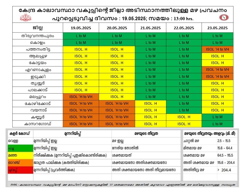 കേന്ദ്ര കാലാവസ്ഥാവകുപ്പിന്റെ അടുത്ത 5 ദിവസത്തേക്കുള്ള മഴ സാധ്യത പ്രവചനം വിവിധ ജില്ലകളിൽ കേന്ദ്ര കാലാവസ്ഥാ വകുപ്പ് ഓറഞ്ച്, മഞ്ഞ അലർട്ടുകൾ പ്രഖ്യാപിച്ചിരിക്കുന്നു. ഓറഞ്ച് അലർട്ട് 19/05/2025: മലപ്പുറം, കോഴിക്കോട്, വയനാട്, കണ്ണൂർ, കാസറഗോഡ് 20/05/2025: കോഴിക്കോട്, വയനാട്, കണ്ണൂർ, കാസറഗോഡ് 23/05/2025: പത്തനംതിട്ട, ഇടുക്കി, എറണാകുളം ജില്ലകളിൽ കേന്ദ്ര കാലാവസ്ഥ വകുപ്പ് ഓറഞ്ച് അലർട്ട്പ്രഖ്യാപിച്ചിരിക്കുന്നു. ഒറ്റപ്പെട്ടയിടങ്ങളിൽ അതിശക്തമായ മഴയ്ക്കുള്ള സാധ്യതയാണ് പ്രവചിച്ചിരിക്കുന്നത്. 24 മണിക്കൂറിൽ 115.6 mm മുതൽ 204.4 mm വരെ മഴ ലഭിക്കുമെന്നാണ് അതിശക്തമായ മഴ (Very Heavy Rainfall) എന്നത് കൊണ്ട് കേന്ദ്ര കാലാവസ്ഥ വകുപ്പ് അർത്ഥമാക്കുന്നത്. മഞ്ഞ അലർട്ട് 19/05/2025: പത്തനംതിട്ട, ആലപ്പുഴ, കോട്ടയം, ഇടുക്കി, എറണാകുളം, തൃശൂർ, പാലക്കാട് 20/05/2025: പത്തനംതിട്ട, ആലപ്പുഴ, കോട്ടയം, ഇടുക്കി,…
