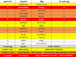 konnivartha.com: കേരളത്തിൽ ഉയർന്ന അൾട്രാവയലറ്റ് രേഖപ്പെടുത്തി .കൊട്ടാരക്കരയിലും മൂന്നാറും റെഡ് അലേര്ട്ട് പ്രഖ്യാപിച്ചു . അഞ്ചു സ്ഥലങ്ങളില് തുടര്ച്ചയായി ഓറഞ്ച് അലേര്ട്ട് ആണ് രേഖപ്പെടുത്തിയത്…