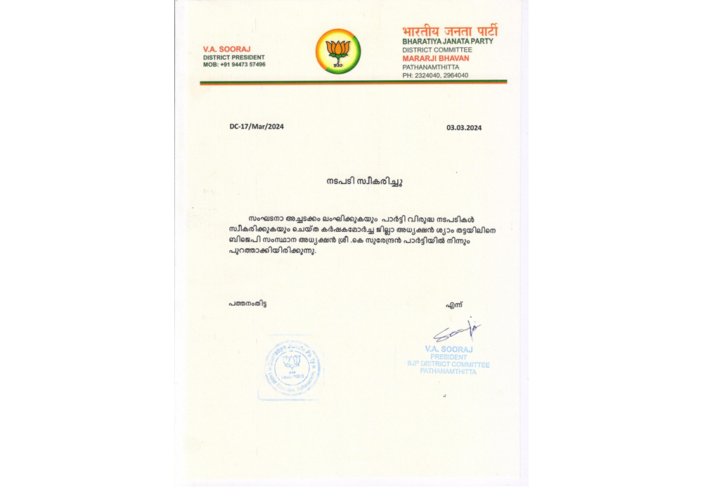 konnivartha.com:പി.സി. ജോര്ജിന് പത്തനംതിട്ട ലോക്സഭാ മണ്ഡലത്തില് സ്ഥാനാര്ഥിത്വം നല്കാത്തതില് പ്രതിഷേധിച്ച് സോഷ്യല് മീഡിയയിലുടെ ബിജെപി നേതൃത്വത്തിനെതിരേ ആഞ്ഞടിച്ച കര്ഷക മോര്ച്ച ജില്ലാ പ്രസിഡന്റ് ശ്യാംതട്ടയിലിനെ പാര്ട്ടിയില് നിന്ന് പുറത്താക്കി. സംസ്ഥാന പ്രസിഡന്റ് കെ. സുരേന്ദ്രന്റെ നിര്ദേശപ്രകാരം ജില്ലാ പ്രസിഡന്റ് അഡ്വ. വി.എ.സൂരജ് ആണ് ശ്യാമിനെ പുറത്താക്കിയിരിക്കുന്നത്. സംസ്ഥാന-ജില്ലാ നേതാക്കളെ അധിക്ഷേപിക്കുന്ന തരത്തിലാണ് ശ്യാം സോഷ്യല് മീഡിയയില് പ്രതികരിച്ചത്. പി.സിക്ക് സീറ്റ് ലഭിക്കില്ലെന്ന് മുന്കൂട്ടി അറിഞ്ഞ് ശ്യാം രണ്ടു ദിവസം മുന്പ് സോഷ്യല് മീഡിയയില് പ്രതികരണം നടത്തിയിരുന്നു. പത്തനംതിട്ടയില് പി.സിയെ പരിഗണിക്കാന് നിങ്ങള്ക്ക് തടസമെന്തെന്നായിരുന്നു ശ്യാം ജോര്ജിന്റെ പടകം സഹിതം എഫ്ബിയില് പോസ്റ്റ് ചെയ്തത്. ഇത് വിവാദമായതോടെ പോസ്റ്റ് ഡിലീറ്റ് ചെയ്ത ശ്യാം താന് നേതൃത്വത്തില് നിന്ന് ഒഴിയുകയാണെന്ന് പോസ്റ്റ് ഇട്ടിരുന്നു. അതിങ്ങനെ: ആസന്നമായ പൊതു തെരഞ്ഞെടുപ്പില് പാര്ട്ടിയുടെ പ്രധാന ജില്ലാ ചുമതലയിലിരുന്ന് വ്യക്തി പരമായ അഭിപ്രവയങ്ങള്…