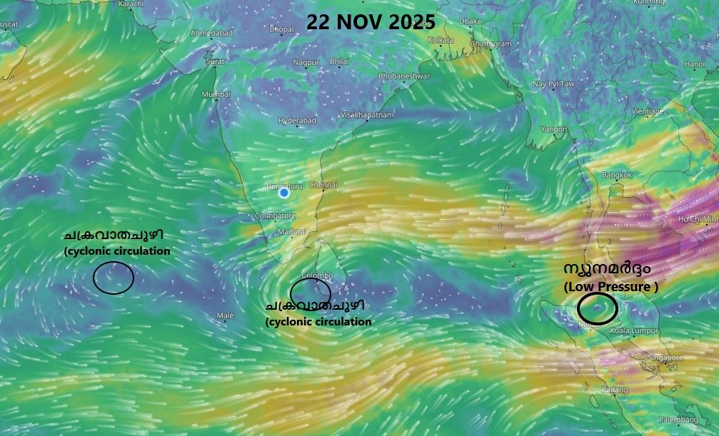 കന്യാകുമാരി കടലിനും ഭൂമധ്യ രേഖക്ക് സമീപമുള്ള ഇന്ത്യൻ മഹാസമുദ്രത്തിനും മുകളിലായി ചക്രവാതച്ചുഴി (cyclonic circulation) സ്ഥിതിചെയ്യുന്നു ബംഗാൾ ഉൾക്കടലിൽ ന്യുനമർദ്ദം മലാക്ക കടലിടുക്കിനും തെക്കൻ ആൻഡമാൻ കടലിനും മുകളിലായി പുതിയ ന്യുനമർദ്ദം (Low Pressure ) രൂപപ്പെട്ടു. പടിഞ്ഞാറ്-വടക്കുപടിഞ്ഞാറ് ദിശയിൽ സഞ്ചരിച്ച് നവംബർ 24-ഓടെ തെക്കു കിഴക്കൻ ബംഗാൾ ഉൾക്കടലിന് മുകളിൽ തീവ്ര ന്യുനമർദ്ദമായി (Depression) ശക്തിപ്പെടാൻ സാധ്യത. തുടർന്നുള്ള 48 മണിക്കൂറിനിടെ, പടിഞ്ഞാറ്-വടക്കുപടിഞ്ഞാറ് ദിശയിൽ സഞ്ചരിച്ച് തെക്കുപടിഞ്ഞാറൻ ബംഗാൾ ഉൾക്കടലിൽ വീണ്ടും ശക്തി പ്രാപിക്കാനും സാധ്യത തെക്ക് കിഴക്കൻ അറബിക്കടലിന് മുകളിൽ ചക്രവാതചുഴിസ്ഥിതി ചെയ്യുന്നു. കേരളത്തിൽ അടുത്ത 5 ദിവസം നേരിയ /ഇടത്തരം മഴയ്ക്ക് സാധ്യത . നവംബർ 22 – 26 തീയതികളിൽ ഒറ്റപ്പെട്ട ശക്തമായ മഴയ്ക്ക് സാധ്യത . നവംബർ 22 മുതൽ 26 വരെ ഇടിമിന്നലിനും സാധ്യത വിവിധ ജില്ലകളിൽ…