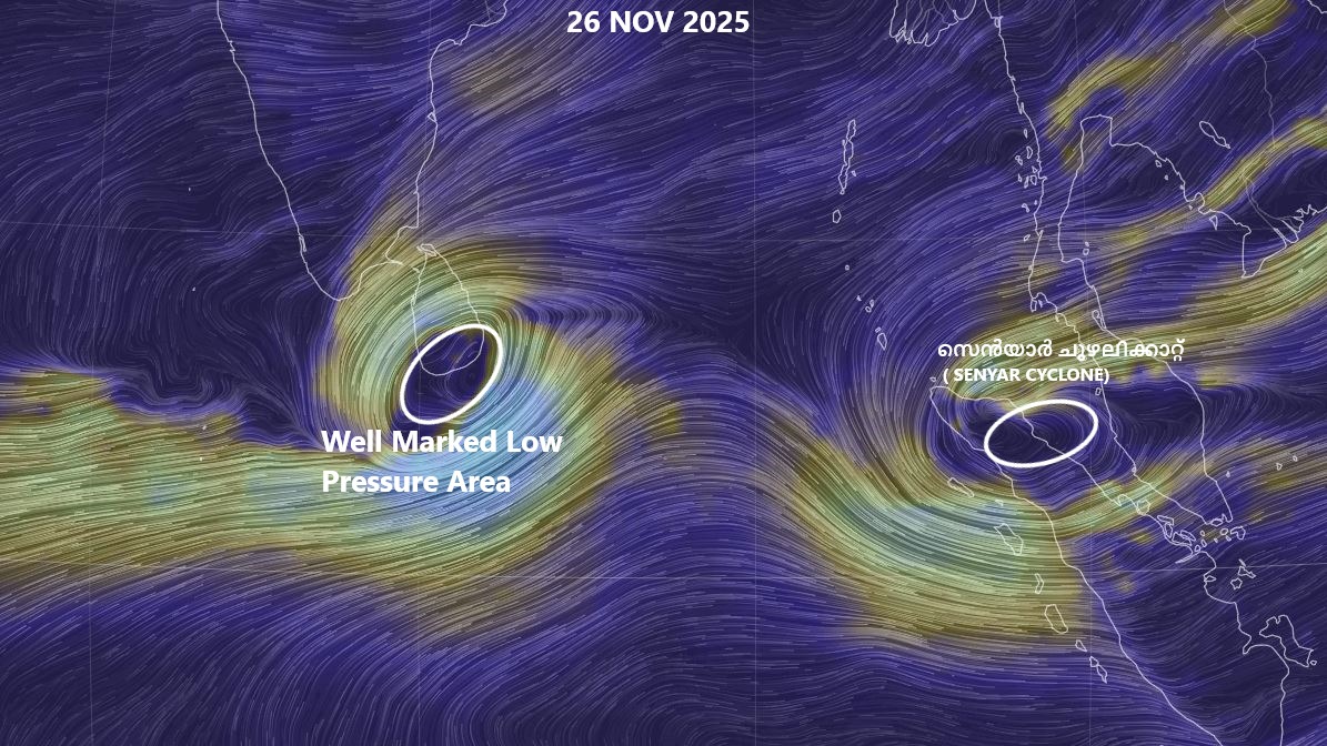 26/11/2025 : തിരുവനന്തപുരം, കൊല്ലം, പത്തനംതിട്ട എന്നീ ജില്ലകളിലാണ് മഞ്ഞ അലർട്ട് പ്രഖ്യാപിച്ചിട്ടുള്ളത്. ഒറ്റപ്പെട്ട ശക്തമായ മഴയ്ക്കുള്ള സാധ്യതയാണ് പ്രവചിക്കപ്പെട്ടിരിക്കുന്നത്. 24 മണിക്കൂറിൽ 64.5 മില്ലിമീറ്റർ മുതൽ 115.5 മില്ലിമീറ്റർ വരെ മഴ ലഭിക്കുന്ന സാഹചര്യത്തെയാണ് ശക്തമായ മഴ എന്നത് കൊണ്ട് അർത്ഥമാക്കുന്നത്. ശക്തി കൂടിയ ന്യുനമർദ്ദം : തെക്കുപടിഞ്ഞാറൻ ബംഗാൾ ഉൾക്കടലിനും തെക്കുകിഴക്കൻ ശ്രീലങ്കക്കും ഭൂമധ്യരേഖക്കു സമീപമുള്ള ഇന്ത്യൻ മഹാസമുദ്രത്തിനും മുകളിലായി ശക്തി കൂടിയ ന്യുനമർദ്ദം സ്ഥിതി ചെയ്യുന്നു .അടുത്ത 24 മണിക്കൂറിനുള്ളിൽ വടക്ക്-വടക്കുപടിഞ്ഞാറ് ദിശയിൽ സഞ്ചരിച്ചു തീവ്ര ന്യുനമർദ്ദമായി (Depression ) ശക്തിപ്രാപിക്കാൻ സാധ്യത. തുടർന്നുള്ള 48 മണിക്കൂറിനുള്ളിൽ ഇത് കൂടുതൽ ശക്തി പ്രാപിച്ച് വടക്ക്-വടക്കുപടിഞ്ഞാറ് ദിശയിൽ സഞ്ചരിച്ചു തെക്കുപടിഞ്ഞാറൻ ബംഗാൾ ഉൾക്കടൽ വഴി വടക്കൻ തമിഴ്നാട്–പുതുച്ചേരി തീരത്തേക്ക് നീങ്ങാൻ സാധ്യത. മലേഷ്യക്കും മലാക്ക കടലിടുക്കിനും മുകളിൽ സ്ഥിതി ചെയ്തിരുന്ന തീവ്ര ന്യുനമർദ്ദം…
