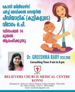 കോന്നി ബിലീവേഴ്സ് ചര്ച്ച് മെഡിക്കല് സെന്ററില് പീഡിയാട്രിക് (കുട്ടികളുടെ ) വിഭാഗം ഒ. പി. ഡിസംബര് 14 മുതല് ആരംഭിക്കുന്നു