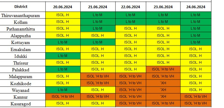കേരളത്തിലെ തിരുവനന്തപുരം, കൊല്ലം, പത്തനംതിട്ട, കോട്ടയം, എറണാകുളം, തൃശ്ശൂർ, മലപ്പുറം, കോഴിക്കോട്, കണ്ണൂർ ജില്ലകളിൽ ഒറ്റപ്പെട്ടയിടങ്ങളിൽ ഇടിമിന്നലോട് കൂടിയ മിതമായ മഴയ്ക്കും മണിക്കൂറിൽ 40 കിലോമീറ്റർ വരെ വേഗതയിൽ വീശിയേക്കാവുന്ന ശക്തമായ കാറ്റിനും; മറ്റു ജില്ലകളിൽ ഒറ്റപ്പെട്ടയിടങ്ങളിൽ നേരിയതോ മിതമായതോ ആയ മഴയ്ക്കും സാധ്യതയുണ്ടെന്ന് കേന്ദ്ര കാലാവസ്ഥ വകുപ്പ് അറിയിച്ചു Thunderstorm with moderate rainfall & gusty winds speed reaching 40 Kmph is likely at one or two places in Thiruvananthapuram, Kollam, Pathanamthitta, Kottayam, Ernakulam, Thrissur, Malappuram, Kozhikode and Kannur districts; Light to moderate rainfall is likely to occur at one or two places in all other districts of Kerala.