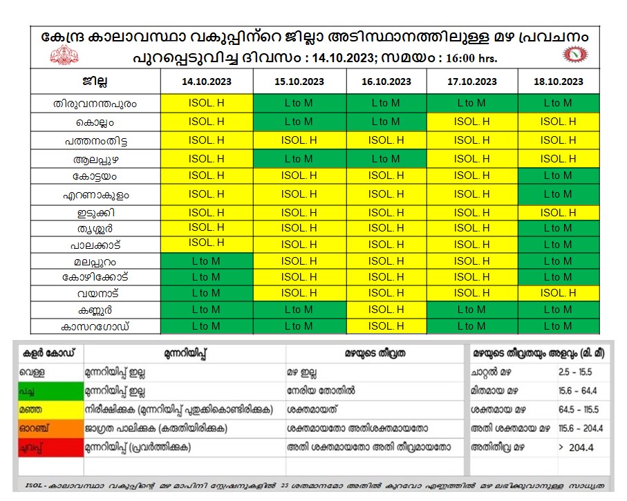 konnivartha.com: കേന്ദ്ര കാലാവസ്ഥാവകുപ്പിന്റെ അടുത്ത 5 ദിവസത്തേക്കുള്ള പുതുക്കിയ മഴ സാധ്യത പ്രവചനം വിവിധ ജില്ലകളിൽ കേന്ദ്ര കാലാവസ്ഥ വകുപ്പ് മഞ്ഞ (Yellow) അലർട്ട് പ്രഖ്യാപിച്ചിരിക്കുന്നു. 14-10-2023 : തിരുവനന്തപുരം, കൊല്ലം, പത്തനംതിട്ട, ആലപ്പുഴ, കോട്ടയം, എറണാകുളം, ഇടുക്കി, തൃശ്ശൂർ, പാലക്കാട് 15-10-2023 : പത്തനംതിട്ട, കോട്ടയം, എറണാകുളം, ഇടുക്കി, തൃശ്ശൂർ, പാലക്കാട്, മലപ്പുറം, കോഴിക്കോട്, വയനാട് 16-10-2023 : പത്തനംതിട്ട, കോട്ടയം, എറണാകുളം, ഇടുക്കി, തൃശ്ശൂർ, പാലക്കാട്, മലപ്പുറം, കോഴിക്കോട്, വയനാട്, കണ്ണൂർ, കാസറഗോഡ് 17-10-2023 : കൊല്ലം, പത്തനംതിട്ട, ആലപ്പുഴ, കോട്ടയം, എറണാകുളം, ഇടുക്കി, തൃശ്ശൂർ, പാലക്കാട്, മലപ്പുറം, കോഴിക്കോട്, വയനാട് 18-10-2023 : കൊല്ലം, പത്തനംതിട്ട, ആലപ്പുഴ, ഇടുക്കി, വയനാട് എന്നീ ജില്ലകളിലാണ് മഞ്ഞ അലർട്ട് പ്രഖ്യാപിച്ചിട്ടുള്ളത്. ഒറ്റപ്പെട്ട ശക്തമായ മഴയ്ക്കുള്ള സാധ്യതയാണ് പ്രവചിക്കപ്പെട്ടിരിക്കുന്നത്. 24 മണിക്കൂറിൽ 64.5 മില്ലിമീറ്റർ മുതൽ…