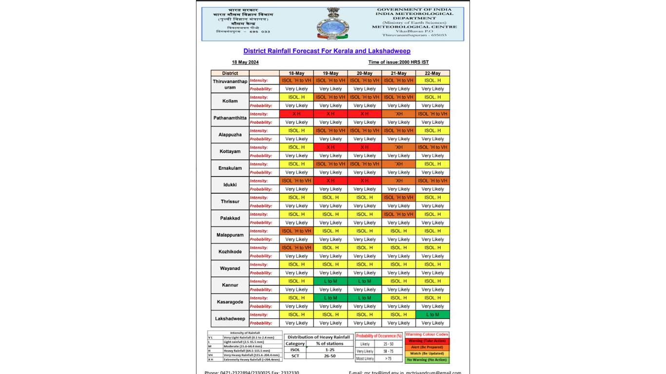 konnivartha.com: കേരളത്തിൽ അതിതീവ്ര മഴക്ക് സാധ്യതയുള്ളതിനാൽ കേന്ദ്ര കാലാവസ്ഥ വകുപ്പ് റെഡ് അലർട്ട് പ്രഖ്യാപിച്ചിരിക്കുന്നു. കേന്ദ്ര കാലാവസ്ഥാവകുപ്പിന്റെ അടുത്ത 5 ദിവസത്തേക്കുള്ള പുതുക്കിയ മഴ സാധ്യത പ്രവചനം വിവിധ ജില്ലകളിൽ കേന്ദ്ര കാലാവസ്ഥ വകുപ്പ് റെഡ്, ഓറഞ്ച്, മഞ്ഞ അലർട്ട് പ്രഖ്യാപിച്ചിരിക്കുന്നു. റെഡ് അലർട്ട് 18-05-2024 :പത്തനംതിട്ട 19-05-2024 :പത്തനംതിട്ട, കോട്ടയം, ഇടുക്കി 20-05-2024 :പത്തനംതിട്ട, കോട്ടയം, ഇടുക്കി ജില്ലകളിൽ കേന്ദ്ര കാലാവസ്ഥ വകുപ്പ് റെഡ് അലർട്ട് പ്രഖ്യാപിച്ചിരിക്കുന്നു. ഒറ്റപ്പെട്ടയിടങ്ങളിൽ അതിതീവ്രമായ മഴക്കുള്ള സാധ്യതയാണ് പ്രവചിച്ചിരിക്കുന്നത്. 24 മണിക്കൂറിൽ 204.4 mm യിൽ കൂടുതൽ മഴ ലഭിക്കുമെന്നാണ് അതിതീവ്രമായ മഴ (Extremely Heavy Rainfall) എന്നത് കൊണ്ട് കാലാവസ്ഥ വകുപ്പ് അർത്ഥമാക്കുന്നത്. ഓറഞ്ച് അലർട്ട് 18-05-2024: തിരുവനന്തപുരം, ഇടുക്കി, മലപ്പുറം, കോഴിക്കോട് 19-05-2024: തിരുവനന്തപുരം, കൊല്ലം, ആലപ്പുഴ, എറണാകുളം 20-05-2024: തിരുവനന്തപുരം, കൊല്ലം, ആലപ്പുഴ, എറണാകുളം…