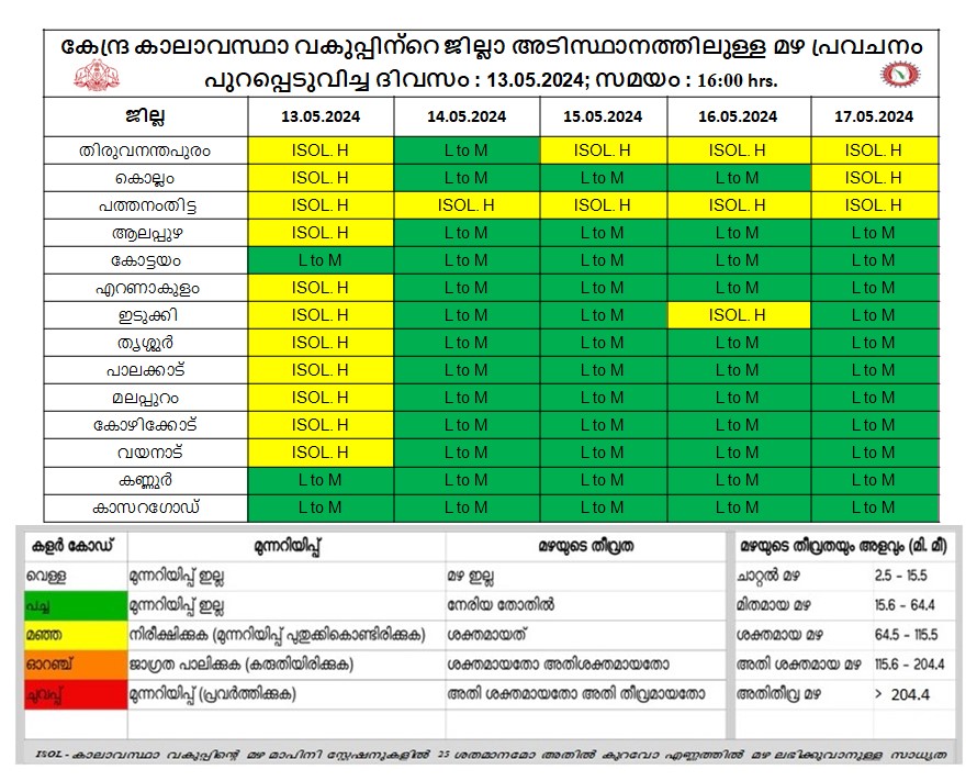 വിവിധ ജില്ലകളിൽ കേന്ദ്ര കാലാവസ്ഥാവകുപ്പ് മഞ്ഞ അലർട്ട് പ്രഖ്യാപിച്ചിരിക്കുന്നു. 13-05-2024: തിരുവനന്തപുരം, കൊല്ലം, പത്തനംതിട്ട, ആലപ്പുഴ, എറണാകുളം, ഇടുക്കി, തൃശ്ശൂർ, പാലക്കാട്, മലപ്പുറം, കോഴിക്കോട്, വയനാട് 14-05-2024: പത്തനംതിട്ട 15-05-2024: തിരുവനന്തപുരം, പത്തനംതിട്ട 16-05-2024: തിരുവനന്തപുരം, പത്തനംതിട്ട, ഇടുക്കി 17-05-2024: തിരുവനന്തപുരം, കൊല്ലം, പത്തനംതിട്ട എന്നീ ജില്ലകളിൽ കേന്ദ്ര കാലാവസ്ഥാവകുപ്പ് മഞ്ഞ അലർട്ട് പ്രഖ്യാപിച്ചിരിയ്ക്കുന്നു. ഒറ്റപ്പെട്ട ശക്തമായ മഴയ്ക്കുള്ള സാധ്യതയാണ് പ്രവചിക്കപ്പെട്ടിരിക്കുന്നത്. 24 മണിക്കൂറിൽ 64.5 മില്ലിമീറ്ററിൽ മുതൽ 115.5 മില്ലിമീറ്റർ വരെ മഴ ലഭിക്കുന്ന സാഹചര്യത്തെയാണ് ശക്തമായ മഴ എന്നത് കൊണ്ട് അർത്ഥമാക്കുന്നത്. ഇടിമിന്നൽ ജാഗ്രതാ നിർദേശം 2024 മെയ് 13,16,17 തീയതികളിൽ കേരളത്തിൽ ഒറ്റപ്പെട്ടയിടങ്ങളിൽ ഇടിമിന്നലോടു കൂടിയ മഴയ്ക്കും മണിക്കൂറിൽ 40 മുതൽ 50 കി.മീ വരെ വേഗതയിൽ വീശിയേക്കാവുന്ന ശക്തമായ കാറ്റിനും, 2024 മെയ് 14 &15 തീയതികളിൽ കേരളത്തിൽ ഒറ്റപ്പെട്ടയിടങ്ങളിൽ…