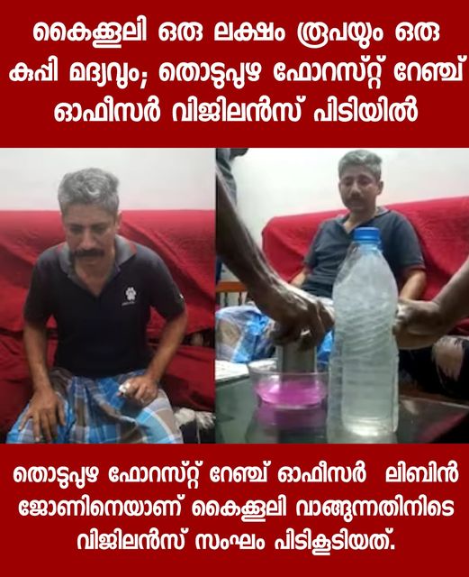 കൈക്കൂലി വാങ്ങുന്നതിനിടെ ഫോറസ്റ്റ് റേഞ്ച് ഓഫീസർ അറസ്റ്റിൽ. തൊടുപുഴ ഫോറസ്റ്റ് റേഞ്ച് ഓഫീസര് ലിബിൻ ജോണിനെയാണ് കൈക്കൂലി വാങ്ങുന്നതിനിടെ വിജിലന്സ് സംഘം പിടികൂടിയത്. കുബേര കേസിലെ പ്രതിയിൽ നിന്നും ഒരു ലക്ഷം രൂപയും ഒരു കുപ്പി മദ്യവും വാങ്ങുന്നതിനിടെയായിരുന്നു അറസ്റ്റ്. തൊടുപുഴ സ്വദേശിയുടെ വീട്ടിൽ നിന്നും മാൻകൊമ്പ് കണ്ടെടുത്ത കേസ് ലഘൂകരിക്കുന്നതിന് വേണ്ടിയാണ് ഫോറസ്റ്റ് റേഞ്ച് ഓഫീസർ കൈക്കൂലി ആവശ്യപ്പെട്ടത്. പരാതിക്കാരന്റെ വീട്ടിൽ ഓപ്പറേഷൻ കുബേരയുടെ ഭാഗമായി തൊടുപുഴ പോലീസ് നടത്തിയ റെയ്ഡിൽ മാൻകൊമ്പിന്റെ കഷണം കണ്ടെത്തിയിരുന്നു. ഇത് ഫോറസ്റ്റിന് കൈമാറിയതിന് പിന്നാലെ തൊടുപുഴ ഫോറസ്റ്റ് റെയിഞ്ച് ഓഫീസിൽ പരാതിക്കാരനെതിരെ കേസ് രജിസ്റ്റർ ചെയ്തു. ഈ കേസ് ലഘൂകരിച്ച് നൽകാമെന്നും അറസ്റ്റ് ഒഴിവാക്കാമെന്നും അതിനായി ഒരു ലക്ഷം രൂപയും മദ്യവും വേണമെന്നും റേഞ്ച് ഓഫീസർ ആവശ്യപ്പെട്ടു. മദ്യം മുട്ടത്തുള്ള റേഞ്ച് ഓഫീസറുടെ ക്വാർട്ടേഴ്സിൽ എത്തിച്ചു നൽകിയപ്പോൾ…