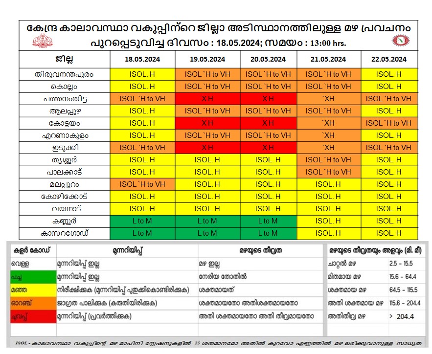 konnivartha.com: കേരളത്തിൽ അതിതീവ്ര മഴക്ക് സാധ്യതയുള്ളതിനാൽ കേന്ദ്ര കാലാവസ്ഥ വകുപ്പ് റെഡ് അലർട്ട് പ്രഖ്യാപിച്ചിരിക്കുന്നു.കേന്ദ്ര കാലാവസ്ഥാവകുപ്പിന്റെ അടുത്ത 5 ദിവസത്തേക്കുള്ള മഴ സാധ്യത പ്രവചനം വിവിധ ജില്ലകളിൽ കേന്ദ്ര കാലാവസ്ഥ വകുപ്പ് റെഡ്, ഓറഞ്ച്, മഞ്ഞ അലർട്ട് പ്രഖ്യാപിച്ചിരിക്കുന്നു. റെഡ് അലർട്ട് 19-05-2024 :പത്തനംതിട്ട, ആലപ്പുഴ, കോട്ടയം, ഇടുക്കി 20-05-2024 :പത്തനംതിട്ട, ആലപ്പുഴ, കോട്ടയം, ഇടുക്കി 21-05-2024 :പത്തനംതിട്ട, ആലപ്പുഴ, കോട്ടയം, ഇടുക്കി ജില്ലകളിൽ കേന്ദ്ര കാലാവസ്ഥ വകുപ്പ് റെഡ് അലർട്ട് പ്രഖ്യാപിച്ചിരിക്കുന്നു. ഒറ്റപ്പെട്ടയിടങ്ങളിൽ അതിതീവ്രമായ മഴക്കുള്ള സാധ്യതയാണ് പ്രവചിച്ചിരിക്കുന്നത്. 24 മണിക്കൂറിൽ 204.4 mm യിൽ കൂടുതൽ മഴ ലഭിക്കുമെന്നാണ് അതിതീവ്രമായ മഴ (Extremely Heavy Rainfall) എന്നത് കൊണ്ട് കാലാവസ്ഥ വകുപ്പ് അർത്ഥമാക്കുന്നത്. ഓറഞ്ച് അലർട്ട് 19-05-2024: തിരുവനന്തപുരം, കൊല്ലം, എറണാകുളം 20-05-2024: തിരുവനന്തപുരം, കൊല്ലം, എറണാകുളം 21-05-2024: തിരുവനന്തപുരം, കൊല്ലം, എറണാകുളം…