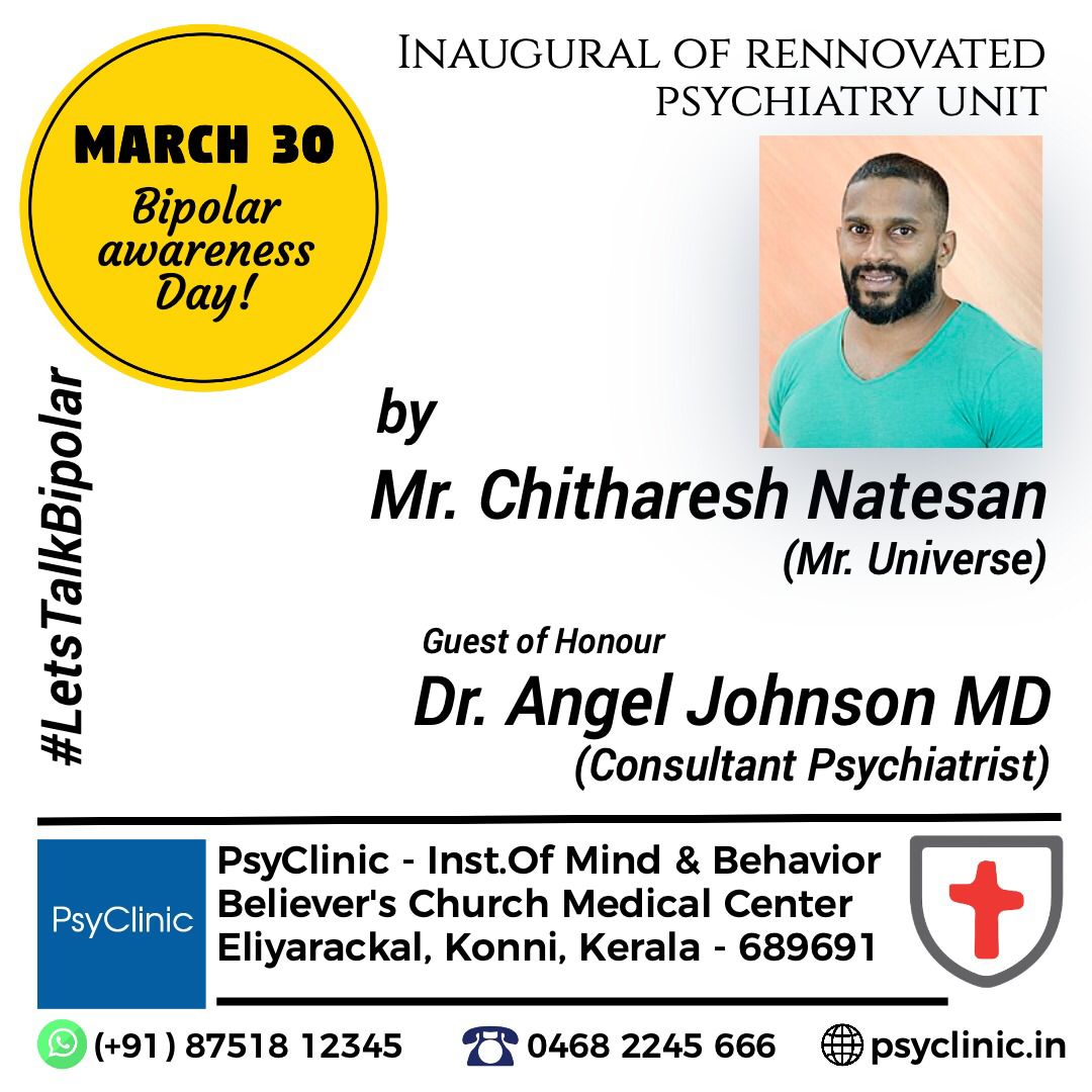 കോന്നി ബിലീവേഴ്സ് ആശുപത്രിയിലെ നവീകരിച്ച സൈക്യാട്രി വിഭാഗം ഉദ്ഘാടനം ലോക ബൈ പോളാര് ദിനമായ ( മാര്ച്ച് 30 ) ന് നടക്കും . രാവിലെ പത്തു മണിയ്ക്ക് മിസ്റ്റര് യൂണിവേഴ്സ് ചിത്തരേഷ് നടേശന് ഉദ്ഘാടനം നടത്തും . ആശുപത്രി ചീഫ് എക്സിക്യൂട്ടീവ് ഓഫീസര് ഡോ ജിജു ജോസഫ് , സൈക്യാറ്ററി വിഭാഗം മേധാവി ഡോ സിജോ അലക്സ് , സൈക്കോളജിസ്റ്റ് ജോമി എന്നിവര് സംസാരിക്കും .