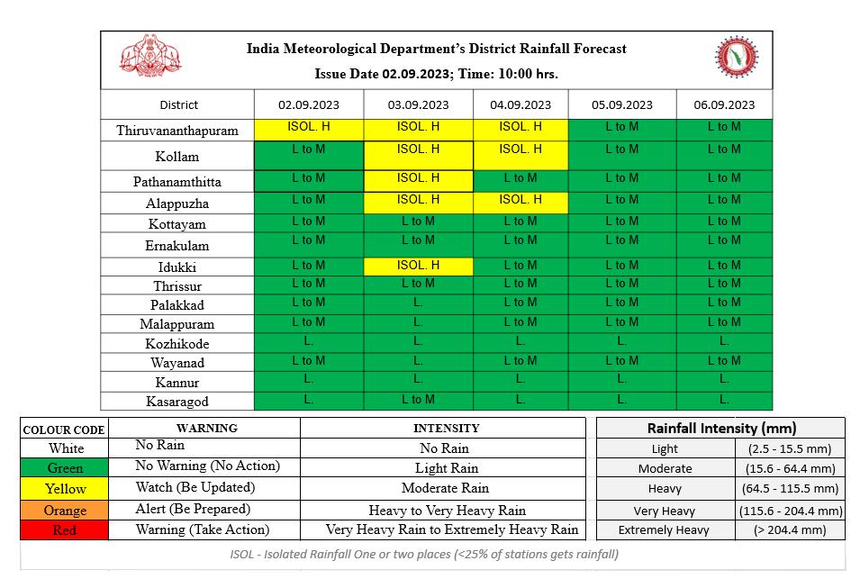 കേന്ദ്ര കാലാവസ്ഥാവകുപ്പിന്റെ അടുത്ത 5 ദിവസത്തേക്കുള്ള മഴ സാധ്യത പ്രവചനം വിവിധ ജില്ലകളിൽ കേന്ദ്ര കാലാവസ്ഥ വകുപ്പ് മഞ്ഞ (Yellow) അലർട്ട് പ്രഖ്യാപിച്ചിരിക്കുന്നു. 02.09.2023 : തിരുവനന്തപുരം 03.09.2023 : തിരുവനന്തപുരം, കൊല്ലം, പത്തനംതിട്ട, ആലപ്പുഴ, ഇടുക്കി 04.09.2023 : തിരുവനന്തപുരം, കൊല്ലം, ആലപ്പുഴ എന്നീ ജില്ലകളിലാണ് മഞ്ഞ അലർട്ട് പ്രഖ്യാപിച്ചിട്ടുള്ളത്. ഒറ്റപ്പെട്ട ശക്തമായ മഴയ്ക്കുള്ള സാധ്യതയാണ് പ്രവചിക്കപ്പെട്ടിരിക്കുന്നത്. 24 മണിക്കൂറിൽ 64.5 മില്ലിമീറ്റർ മുതൽ 115.5 മില്ലിമീറ്റർ വരെ മഴ ലഭിക്കുന്ന സാഹചര്യത്തെയാണ് ശക്തമായ മഴ എന്നത് കൊണ്ട് അർത്ഥമാക്കുന്നത്. വടക്ക് കിഴക്കൻ ബംഗാൾ ഉൾക്കടലിൽ ചക്രവാതചുഴി നിലനിൽക്കുന്നു നാളെയോടെ (സെപ്റ്റംബർ 3 ) വടക്ക് പടിഞ്ഞാറൻ ബംഗാൾ ഉൾക്കടലിൽ പുതിയൊരു ചക്രവാതചുഴി രൂപപ്പെടാൻ സാധ്യത. തുടർന്നുള്ള 48 മണിക്കൂറിൽ ഇത് ന്യുന മർദ്ദമായി ശക്തി പ്രാപിക്കാനും സാധ്യതയെന്ന് കേന്ദ്ര കാലാവസ്ഥ വകുപ്പ് അറിയിക്കുന്നു.…