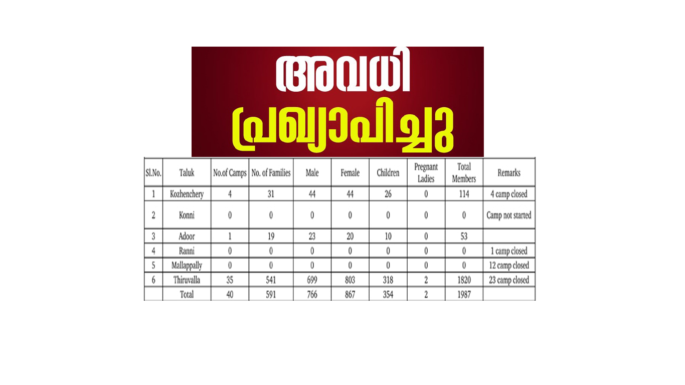 ജില്ലയില് 19 ദുരിതാശ്വാസ ക്യാമ്പുകള്. 195 കുടുംബങ്ങളിലായി 237 പുരുഷന്മാരും 250 സ്ത്രീകളും 120 കുട്ടികളും ഉള്പ്പെടെ 607 പേരാണ് ക്യാമ്പിലുള്ളത്. കോഴഞ്ചേരി, അടൂര് താലൂക്കുകളില് ഓരോ ക്യാമ്പുകളുണ്ട്. കോഴഞ്ചേരി താലൂക്കില് വല്ലന എസ്എന്ഡിപി യുപിഎസില് 10 കുടുംബങ്ങളിലെ 29 പേരും അടൂര് താലൂക്കില് പന്തളം മുടിയൂര്ക്കോണം എംടിഎല്പി സ്കൂളില് മൂന്ന് കുടുംബത്തിലെ ഒമ്പത് പേരുമാണുള്ളത്. തിരുവല്ല താലൂക്കിലാണ് ഏറ്റവും അധികം ക്യാമ്പുകള്. 17 ക്യാമ്പുകളിലായി 182 കുടുംബങ്ങളിലെ 569 പേര് ക്യാമ്പില് കഴിയുന്നു. തിരുവല്ല താലൂക്കില് തോട്ടപ്പുഴശേരി എംടിഎല്പി സ്കൂള്, നിരണം സെന്റ് ജോര്ജ് യുപിഎസ്, തോട്ടപ്പുഴശേരി ചെറുപുഷ്പം എല്പി സ്കൂള്, കാവുംഭാഗം വേങ്ങല് ദേവമാതാ ഓഡിറ്റോറിയം, നിരണം മുകളടി സര്ക്കാര് യുപിഎസ്, കാവുംഭാഗം ഇടിഞ്ഞില്ലം എല്പിഎസ്, കവിയൂര് പടിഞ്ഞാറ്റുംശേരി സര്ക്കാര് എല്പിഎസ്, തിരുവല്ല സിഎംഎസ് എച്ച്എസ്എസ്, കുറ്റപ്പുഴ തിരുമൂലവിലാസം യുപി സ്കൂള്, മുത്തൂര്…