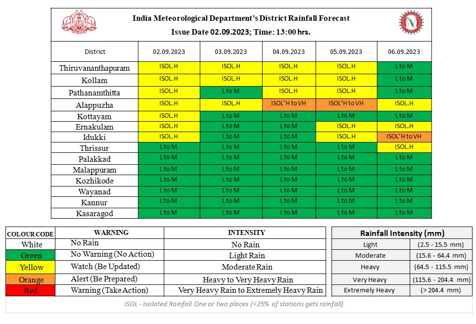 konnivartha.com: കേന്ദ്ര കാലാവസ്ഥാവകുപ്പിന്റെ അടുത്ത 5 ദിവസത്തേക്കുള്ള മഴസാധ്യത പ്രവചനം വിവിധ ജില്ലകളിൽ കേന്ദ്ര കാലാവസ്ഥ വകുപ്പ് ഓറഞ്ച്, മഞ്ഞ അലർട്ടുകൾ പ്രഖ്യാപിച്ചിരിക്കുന്നു ഓറഞ്ച് അലർട്ട് 04-09-2023 & 05-09-2023 : ആലപ്പുഴ 06-09-2023 : ഇടുക്കി ജില്ലകളിൽ കേന്ദ്ര കാലാവസ്ഥ വകുപ്പ് ഓറഞ്ച് അലർട്ട് പ്രഖ്യാപിച്ചിരിക്കുന്നു . ഒറ്റപ്പെട്ടയിടങ്ങളിൽ അതിശക്തമായ മഴക്കുള്ള സാധ്യതയാണ് പ്രവചിച്ചിരിക്കുന്നത്. 24 മണിക്കൂറിൽ 115.6 mm മുതൽ 204.4 mm വരെ മഴ ലഭിക്കുമെന്നാണ് അതിശക്തമായ മഴ (Very Heavy Rainfall) എന്നത് കൊണ്ട് കാലാവസ്ഥ വകുപ്പ് അർത്ഥമാക്കുന്നത്. 02-09-2023 :തിരുവനന്തപുരം, കൊല്ലം, പത്തനംതിട്ട, ആലപ്പുഴ, കോട്ടയം, എറണാകുളം, ഇടുക്കി 03-09-2023 : തിരുവനന്തപുരം, കൊല്ലം, ആലപ്പുഴ 04-09-2023 : തിരുവനന്തപുരം, കൊല്ലം, പത്തനംതിട്ട 05-09-2023 : തിരുവനന്തപുരം, കൊല്ലം, പത്തനംതിട്ട, എറണാകുളം, ഇടുക്കി 06-09-2023 : ആലപ്പുഴ, എറണാകുളം,…
