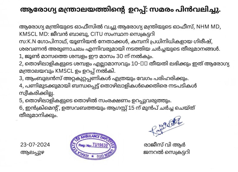 ശമ്പളം മുടങ്ങി; 108 ആംബുലൻസ് ജീവനക്കാരുടെ പണിമുടക്ക് തുടങ്ങി ( 23/07/2024 )