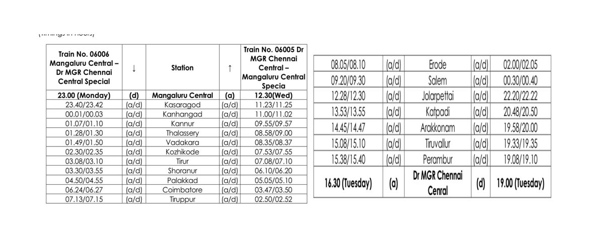 മംഗളൂരു സെന്ട്രലില്നിന്ന് ചെന്നൈ സെന്ട്രലിലേക്കും തിരിച്ചും പ്രത്യേക തീവണ്ടികള് സര്വീസ് നടത്തും.റിസര്വേഷന് ആരംഭിച്ചു.മംഗളൂരു സെന്ട്രല് സ്റ്റേഷനില്നിന്ന് 29-ന് രാത്രി 11-ന് പുറപ്പെടുന്ന പ്രത്യേക വണ്ടി(06006) പിറ്റേന്ന് വൈകിട്ട് 4.30-ന് ചെന്നൈ സെന്ട്രലിലെത്തും. 30-ന് ചെന്നൈ സെന്ട്രലില്നിന്ന് രാത്രി ഏഴിന് പുറപ്പെടുന്ന പ്രത്യേക വണ്ടി(06005) പിറ്റേന്ന് ഉച്ചയോടെ 12.30-ന് മംഗളൂരു സെന്ട്രലിലെത്തും. ജനറല് കോച്ചില്ല. കേരളത്തില് കാസര്കോട്, കാഞ്ഞങ്ങാട്, കണ്ണൂര്, തലശ്ശേരി, വടകര, കോഴിക്കോട്, തിരൂര്, ഷൊര്ണൂര്, പാലക്കാട്, കോയമ്പത്തൂര്, തിരുപ്പൂര്, ഈറോഡ്, സേലം, ജോലാര്പ്പേട്ട, കാട്പാഡി, ആര്ക്കോണം, തിരുവള്ളൂര്, പെരമ്പൂര് എന്നിവിടങ്ങളില് സ്റ്റോപ്പുണ്ടാകും.