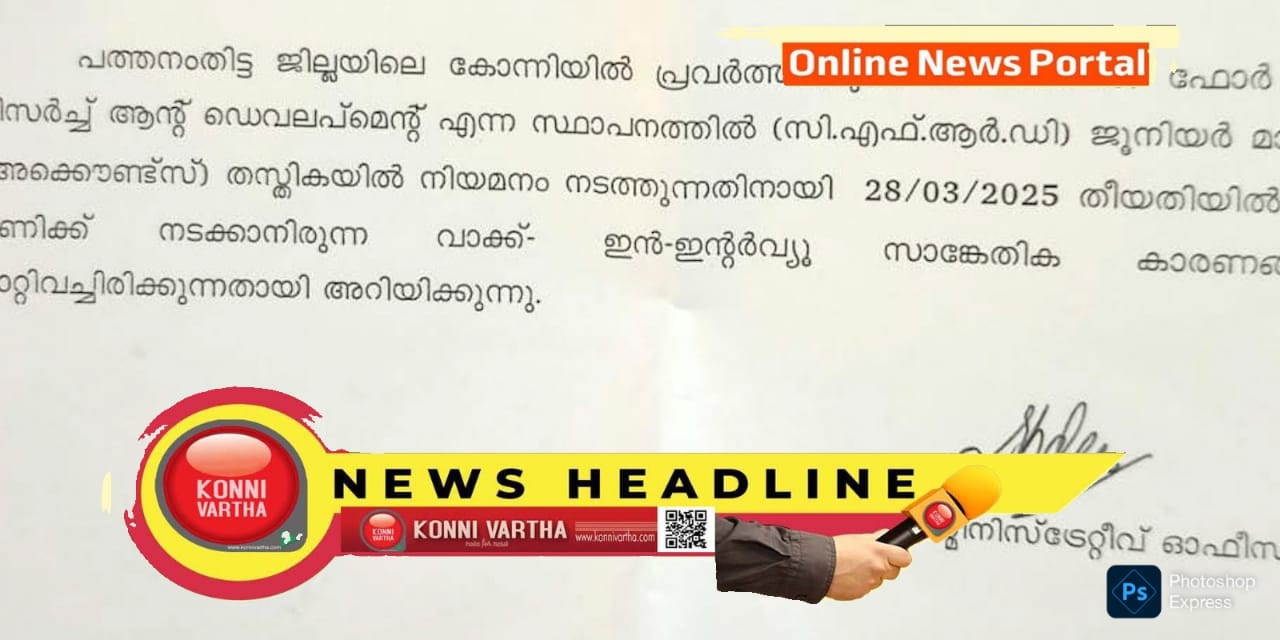 Konnivartha. Com:കോന്നി കൗണ്സില് ഫോര് ഫുഡ് റിസര്ച്ച് ആന്റ് ഡവലപ്മെന്റ് (സി എഫ് ആർ ഡി )സ്ഥാപനത്തില് ജൂനിയര് മാനേജര് (അക്കൗണ്ട്സ്) തസ്തികയില്( 28/03/2025) നടത്താനിരുന്ന ഇന്റർവ്യൂ ചില സാങ്കേതിക കാരണങ്ങളാൽ മാറ്റി വെച്ചതായി അഡ്മിനിസ്ട്രേറ്റീവ് ഓഫീസർ അറിയിച്ചു.