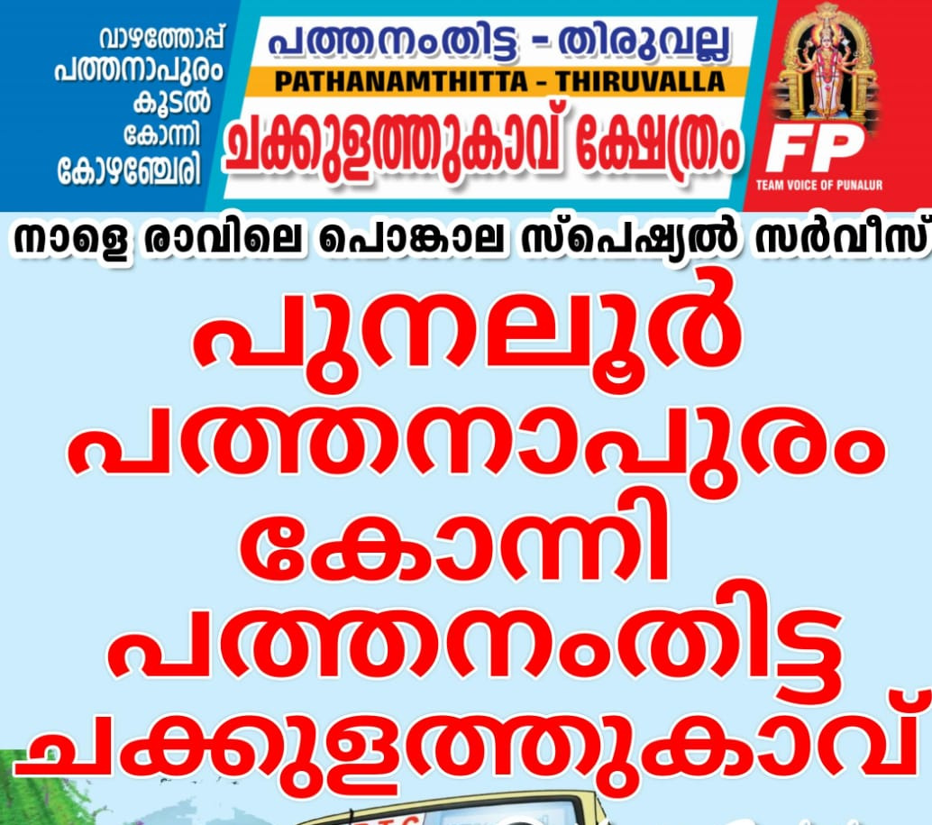 Read Moreപുനലൂരിൽ നിന്നും കോന്നി വഴി നാളെ ചക്കുളത്തുകാവിലേക്ക് പ്രത്യേക ബസ്സ്