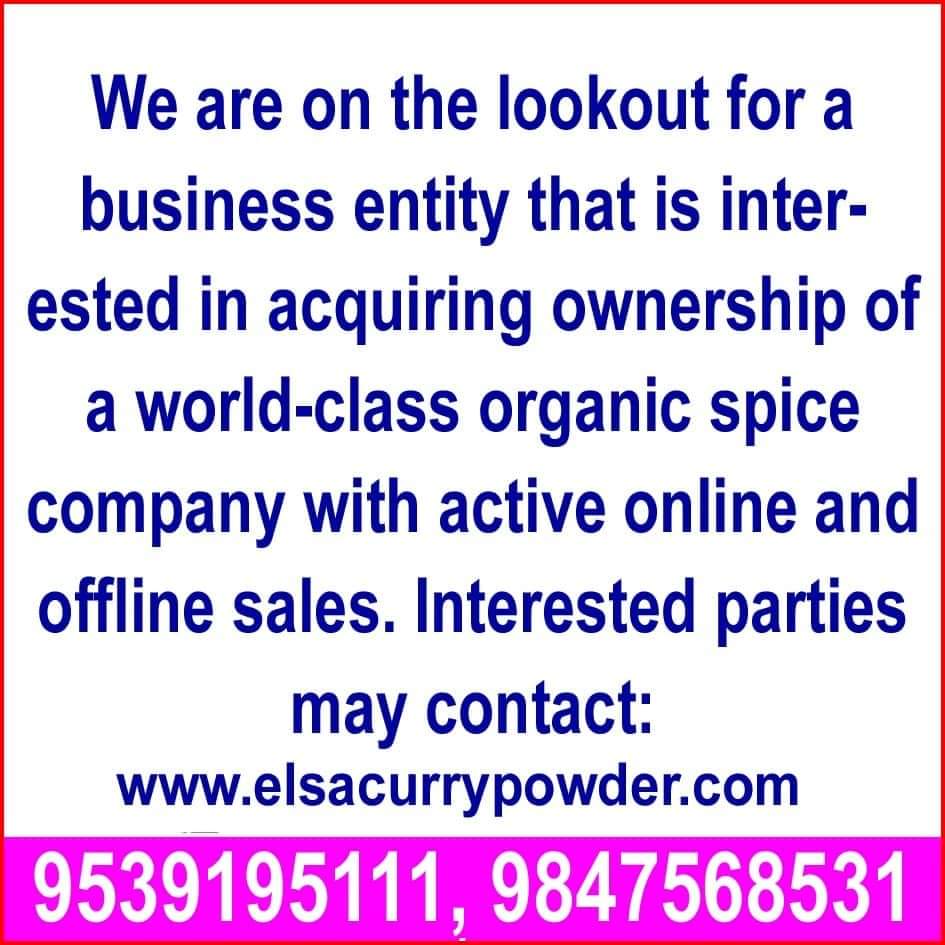 ജൈവ കറി മസാല കമ്പനി കൈമാറ്റത്തിന് ലോകോത്തര ജൈവ കറി മസാല കമ്പനി പേരോട് കൂടി കൈമാറ്റത്തിന് ഉണ്ട് . ഓണ്ലൈന് രംഗത്തെ ആദ്യത്തെ സംരംഭമാണ് വിദേശ രാജ്യങ്ങളിലേക്ക് ഓണ്ലൈന് മുഖേന ജൈവ കറി മസാലകള് കയറ്റി അയച്ചു വരുന്നു . ഈ കമ്പനി കൈമാറ്റത്തിന് ഉണ്ട് . താല്പര്യം ഉള്ളവര് മാത്രം ബന്ധപ്പെടുക ഫോണ് : +91 95391 95111 For transfer of organic curry spice company The world-class organic curry masala is available for transfer under the company name. It is the first venture in the online arena to export organic curry spices online to foreign countries. This company is available for transfer. Contact only…