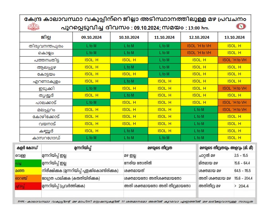 കേന്ദ്ര കാലാവസ്ഥാവകുപ്പിന്റെ അടുത്ത 5 ദിവസത്തേക്കുള്ള മഴ സാധ്യത പ്രവചനം വിവിധ ജില്ലകളിൽ കേന്ദ്ര കാലാവസ്ഥവകുപ്പ് ഓറഞ്ച്, മഞ്ഞ അലർട്ടുകൾ പ്രഖ്യാപിച്ചിരിക്കുന്നു ഓറഞ്ച് അലർട്ട് 12/10/2024 : തിരുവനന്തപുരം, കൊല്ലം 13/10/2024 : പത്തനംതിട്ട, ഇടുക്കി, പാലക്കാട്, മലപ്പുറം എന്നീ ജില്ലകളിൽ കേന്ദ്ര കാലാവസ്ഥവകുപ്പ് ഓറഞ്ച് അലർട്ട് പ്രഖ്യാപിച്ചിരിക്കുന്നു. ഒറ്റപ്പെട്ടയിടങ്ങളിൽ അതിശക്തമായ മഴക്കുള്ള സാധ്യതയാണ് പ്രവചിച്ചിരിക്കുന്നത്. 24 മണിക്കൂറിൽ 115.6 mm മുതൽ 204.4 mm വരെ മഴ ലഭിക്കുമെന്നാണ് അതിശക്തമായ മഴ (Very Heavy Rainfall) എന്നത് കൊണ്ട് കാലാവസ്ഥ വകുപ്പ് അർത്ഥമാക്കുന്നത്. മഞ്ഞ അലർട്ട് 09/10/2024 : പത്തനംതിട്ട, ആലപ്പുഴ, കോട്ടയം, എറണാകുളം, തൃശൂർ, മലപ്പുറം, കോഴിക്കോട്, വയനാട്, കണ്ണൂർ 10/10/2024: പത്തനംതിട്ട, കോട്ടയം, ഇടുക്കി, പാലക്കാട്, മലപ്പുറം, കോഴിക്കോട്, വയനാട് 11/10/2024: ഇടുക്കി, എറണാകുളം, തൃശൂർ, പാലക്കാട്, മലപ്പുറം, കോഴിക്കോട്, വയനാട്,…