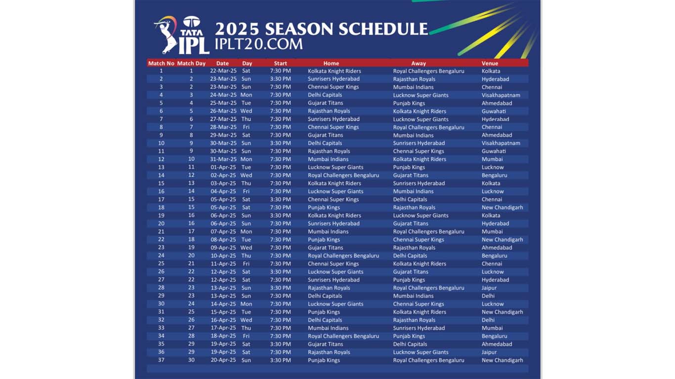 ഐ.പി.എല് ക്രിക്കറ്റ് മത്സരങ്ങളുടെ ഫിക്സ്ചർ ഔദ്യോഗികമായി പുറത്തുവിട്ടു.ഒരുമാസം നീണ്ടുനിൽക്കുന്ന ചാമ്പ്യൻഷിപ്പിലെ ആദ്യമത്സരം മാർച്ച് 22-ന് കൊൽക്കത്ത ഈഡൻ ഗാർഡൻസിൽ നടക്കും. നിലവിലെ ചാമ്പ്യന്മാരായ കൊൽക്കത്ത നൈറ്റ് റൈഡേഴ്സും റോയൽ ചലഞ്ചേഴ്സ് ബെംഗളൂരുവുമാണ് ഉദ്ഘാടനമത്സരത്തിൽ ഏറ്റുമുട്ടുക.13 വേദികളിലായി 74 മത്സരങ്ങൾ നടക്കും. 10 ടീമുകളെ പ്രതിനിധീകരിക്കുന്ന നഗരങ്ങൾക്ക് പുറമേ വിശാഖപട്ടണം, ഗുവാഹാട്ടി, ധർമശാല, എന്നിവിടങ്ങളിലും മത്സരങ്ങൾ നടക്കും. രണ്ടാം ദിവസം ചെന്നൈയിൽ നടക്കുന്ന മത്സരത്തിൽ ചെന്നൈ സൂപ്പർ കിങ്സ് മുംബൈ ഇന്ത്യൻസിനെ നേരിടും. കഴിഞ്ഞവർഷത്തെ ഫൈനലിസ്റ്റുകളായ സൺറൈസേഴ്സ് ഹൈദരാബാദിന്റെ എതിരാളികൾ രാജസ്ഥാൻ റോയൽസാണ്. മാർച്ച് 23-ന് ഹൈദരാബാദിൽവെച്ചാണ് മത്സരം. മേയ് 25-നാണ് ഫൈനൽ.മെയ് 18 നാണ് ലീഗ് ഘട്ടം അവസാനിക്കുക. പ്ലേഓഫുകൾ ഹൈദരാബാദിലും കൊൽക്കത്തയിലുമായി നടക്കും. ക്വാളിഫയർ 1 ഉം എലിമിനേറ്ററും ഹൈദരാബാദിലും ക്വാളിഫയർ 2 ഉം ഫൈനലും കൊൽക്കത്തയിലും നടക്കും. IPL 2025 Full Schedule Announcement,…