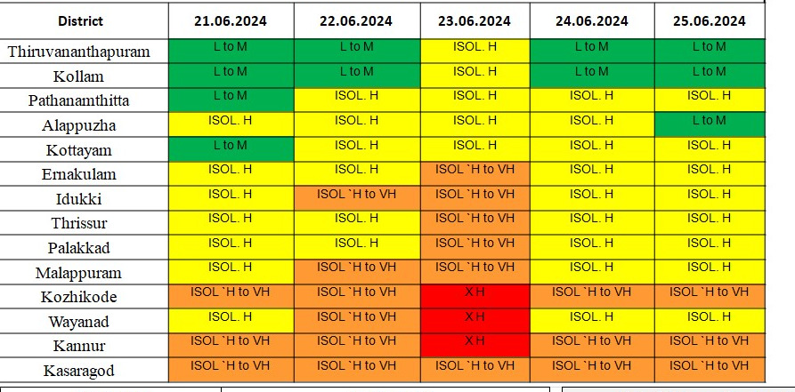 konnivartha.com: വിവിധ ജില്ലകളിൽ കേന്ദ്ര കാലാവസ്ഥ വകുപ്പ് റെഡ്, ഓറഞ്ച് അലർട്ടുകൾ പ്രഖ്യാപിച്ചിരിക്കുന്നു. റെഡ് അലർട്ട് 23-06-2024 : കോഴിക്കോട്, വയനാട്, കണ്ണൂർ ജില്ലകളിൽ കേന്ദ്ര കാലാവസ്ഥ വകുപ്പ് റെഡ് അലർട്ട് പ്രഖ്യാപിച്ചിരിക്കുന്നു. ഒറ്റപ്പെട്ടയിടങ്ങളിൽ അതിതീവ്രമായ മഴക്കുള്ള സാധ്യതയാണ് പ്രവചിച്ചിരിക്കുന്നത്. 24 മണിക്കൂറിൽ 204.4 mm യിൽ കൂടുതൽ മഴ ലഭിക്കുമെന്നാണ് അതിതീവ്രമായ മഴ (Extremely Heavy Rainfall) എന്നത് കൊണ്ട് കേന്ദ്ര കാലാവസ്ഥ വകുപ്പ് അർത്ഥമാക്കുന്നത്. ഓറഞ്ച് അലർട്ട് 21-06-2024: കോഴിക്കോട്, കണ്ണൂർ, കാസറഗോഡ് 22-06-2024: ഇടുക്കി, മലപ്പുറം, കോഴിക്കോട്, വയനാട്, കണ്ണൂർ, കാസറഗോഡ് 23-06-2024: ഇടുക്കി, എറണാകുളം, തൃശ്ശൂർ, പാലക്കാട്, മലപ്പുറം, കാസറഗോഡ് 24-06-2024: കോഴിക്കോട്, കണ്ണൂർ, കാസറഗോഡ് 25-06-2024: കോഴിക്കോട്, കണ്ണൂർ, കാസറഗോഡ് എന്നീ ജില്ലകളിൽ കേന്ദ്ര കാലാവസ്ഥ വകുപ്പ് ഓറഞ്ച് അലർട്ട് പ്രഖ്യാപിച്ചിരിക്കുന്നു. ഒറ്റപ്പെട്ടയിടങ്ങളിൽ അതിശക്തമായ മഴയ്ക്കുള്ള സാധ്യതയാണ് പ്രവചിച്ചിരിക്കുന്നത്.…