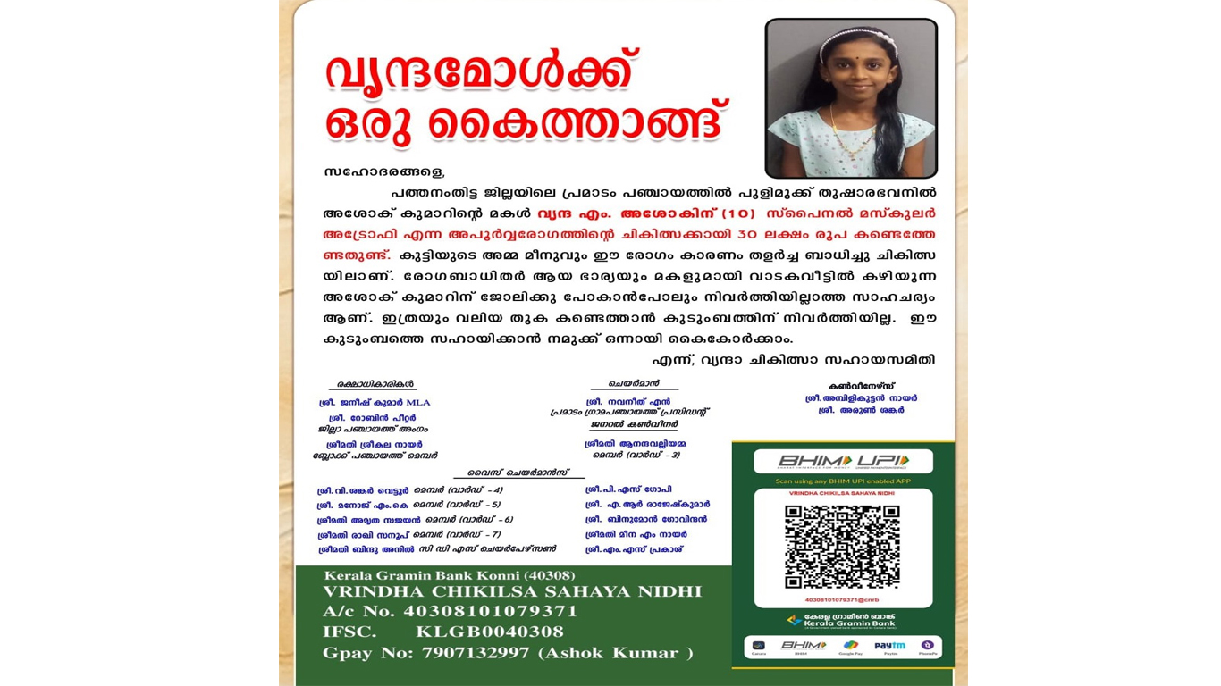 പത്തനംതിട്ട ജില്ലയിലെ പ്രമാടം പഞ്ചായത്തിൽ പുളിമുക്ക് തുഷാരഭവനിൽ അശോകുമാറിന്റെ മകൾ വൃന്ദ എം അശോകന് സ്പൈനല് മസ്കുലര് അട്രോഫി എന്ന അപൂർവ രോഗത്തിന്റെ ചികിത്സയ്ക്കായി 30 ലക്ഷം രൂപ ആവശ്യമാണ് . കുട്ടിയുടെ അമ്മ മീനുവും ഈ രോഗം കാരണം ചികിത്സയിലാണ് .രോഗബാധിതരായ ഭാര്യയും മകളുമായി വാടകവീട്ടിൽ കഴിയുന്ന അശോക് കുമാറിന് ജോലിക്ക് പോകാൻ പോലും നിവൃത്തിയില്ലാത്ത സാഹചര്യത്തിൽ ഇത്രയും തുക കണ്ടെത്തുവാൻ കുടുംബത്തിന് നിവൃത്തിയില്ല . ഈ സാഹചര്യത്തില് കോന്നി എംഎൽഎ ഉൾപ്പെടെ ത്രിതല പഞ്ചായത്ത് ജനപ്രതിനിധികൾ, രാഷ്ട്രീയ പാർട്ടി പ്രതിനിധികൾ, സാമൂഹ്യ പ്രവർത്തകർ എന്നിവരെ ഉൾപ്പെടുത്തിക്കൊണ്ട് വൃന്ദ ചികിത്സാ സഹായനിധി രൂപീകരിച്ചു പ്രവര്ത്തനം ആരംഭിച്ചു . ഈ മാസം 27ആം തീയതി കുട്ടിയെ ചികിത്സയ്ക്കായി ആശുപത്രിയില് പ്രവേശിപ്പിക്കും .വൃന്ദ ചികിത്സാ സഹായനിധിയിലേക്ക് സഹായം ആവശ്യം ആണെന്ന് ബന്ധപ്പെട്ട ഭാരവാഹികള് അറിയിച്ചു . വൃന്ദ…