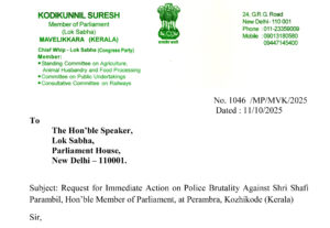 ഷാഫി പറമ്പിൽ എംപിക്കെതിരായ പോലീസ് അതിക്രമത്തിൽ കോൺഗ്രസ് ചീഫ് വിപ്പ് കൊടിക്കുന്നിൽ സുരേഷ് എംപി സ്പീക്കർക്ക് പരാതി നൽകി. konnivartha.com; കോഴിക്കോട് പേരാമ്പ്രയിൽ ഷാഫി…