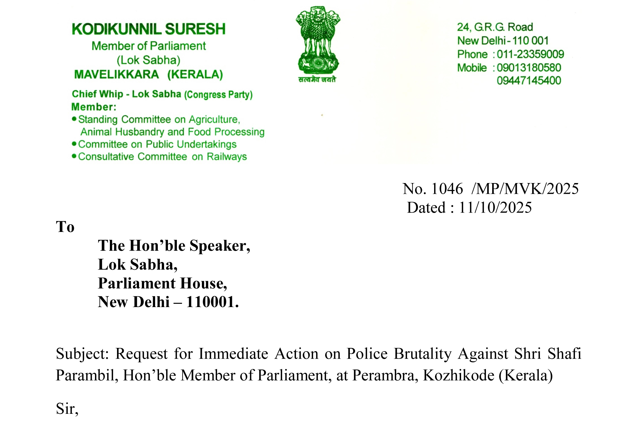 കൊടിക്കുന്നിൽ സുരേഷ് എംപി സ്പീക്കർക്ക് പരാതി നൽകി