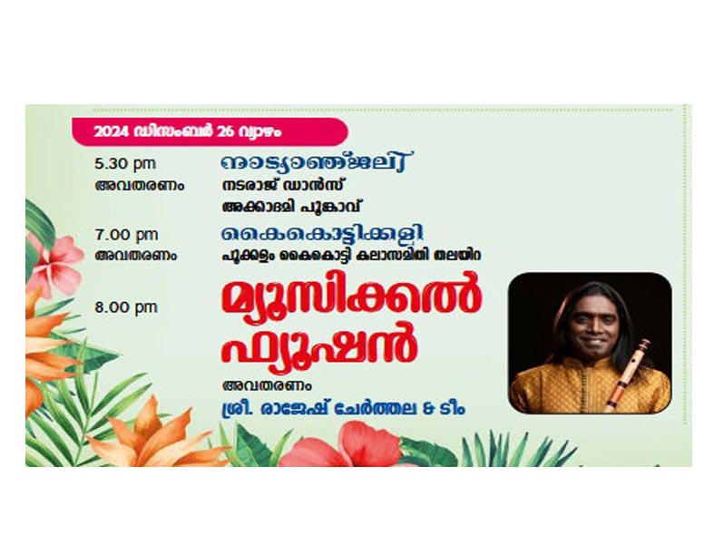 2024 ജനുവരി 23 ചൊവ്വ 5.30 മുതൽ കോന്നി എസ്.എൻ കലാക്ഷേത്ര മ്യൂസിക് & ഡാൻസ് അവതരിപ്പിക്കുന്ന സംഗീത നടന ലയ ചാരുത 8 മുതൽ ചന്ദ്രൻ പരിയാരം സംവിധാനം ചെയ്ത് കോഴിക്കോട് പേരാമ്പ്ര വജ്രിക & കലൈഭാരതി അവതരിപ്പിക്കുന്ന ഡാൻസ് ഫ്യൂഷൻ