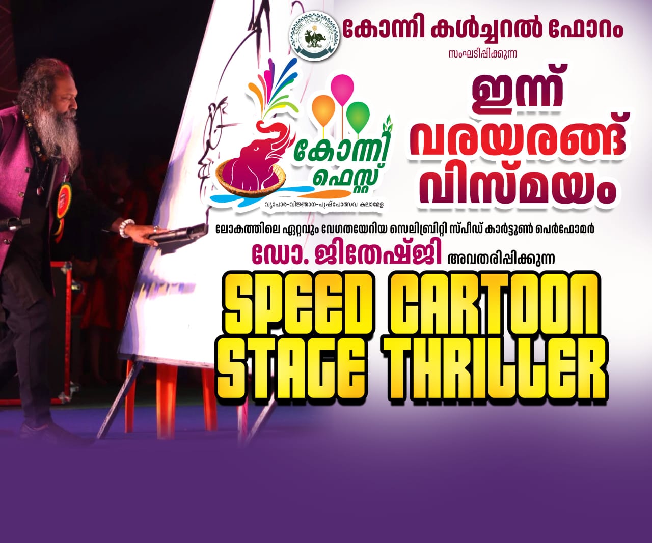 konnivartha.com: വരയുടെ ഇടിമിന്നൽ വേഗത്തുടി, DJ സംഗീതത്തിന്റെ മാസ്മരിക ചടുലതാളലഹരിയിൽ ചാലിച്ച് വരവേഗവിസ്മയമൊരുക്കാൻ പുതുവർഷരാത്രിയിൽ ജനുവരി ഒന്നിന് രാത്രി 7:30 PM മുതൽ 8 PM വരെ ലോകത്തിലെ ഏറ്റവും വേഗതയേറിയ പെർഫോമിംഗ് ചിത്രകാരൻ ഡോ. ജിതേഷ്ജി എത്തുന്നു. ഇടിമിന്നൽ വേഗതയിൽ സ്റ്റൈൽ മന്നൻ രജനി,പുലിവേഗത്തിൽ ചിന്നദളപതി വിജയ്., കെ ജി എഫ് നായകൻ റോക്കി ഭായി, ഫഹദ് ഫാസിൽ, മെസ്സിയും ക്രിസ്ട്ട്യാനോ റൊണാൾഡോയുമടക്കമുള്ള ഡസൻ കണക്കിന് സെലിബ്രിറ്റികളെജിതേഷ്ജി ഡി. ജെ മ്യൂസിക്കിന്റെയും സിനിമാറ്റിക് ഡാൻസ് സ്റ്റെപ്പുകളുടെയും അകമ്പടിയോടെ മാസ്മരിക വേഗതയിൽ അരങ്ങിൽ അവതരിപ്പിക്കും 10 മിനിറ്റിൽ 100 ചിത്രം വരച്ച് വേഗവരയിൽ ലോകറെക്കൊഡ് സൃഷ്ടിച്ച മലയാളിയാണ് ജിതേഷ്ജി . 200 ലക്ഷത്തിലേറെ പ്രേക്ഷകരെ ഇൻസ്റ്റഗ്രാമിൽ നേടിയ ആദ്യ മലയാളിയെന്ന റെക്കോർഡും ഈ പത്തനംതിട്ട ജില്ലക്കാരന്റെ പേരിലാണ്. രാജീവ് ഗാന്ധി ഇൻഡോർ സ്റ്റേഡിയത്തിൽ കോന്നി കൾച്ചറൽ ഫോറം…