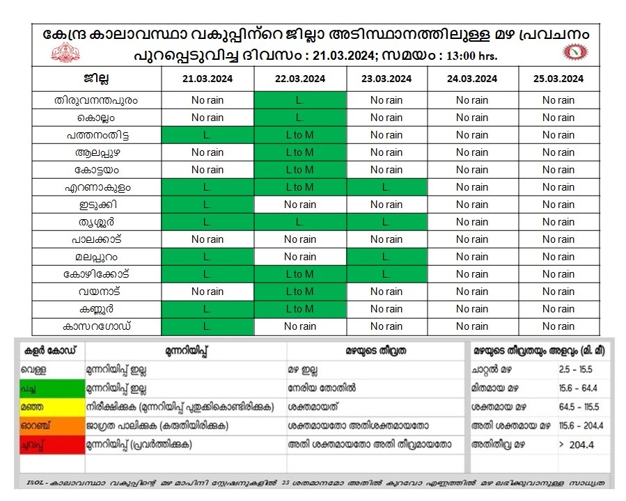 2024 മാർച്ച് 27 വരെ കൊല്ലം, പാലക്കാട് ജില്ലകളിൽ ഉയർന്ന താപനില 39°C വരെയും, കോട്ടയം, തൃശൂർ ജില്ലകളിൽ ഉയർന്ന താപനില 38°C വരെയും, ആലപ്പുഴ,പത്തനംതിട്ട, എറണാകുളം ജില്ലകളിൽ ഉയർന്ന താപനില 37°C വരെയും, തിരുവനന്തപുരം,കോഴിക്കോട് ജില്ലകളിൽ ഉയർന്ന താപനില 36°C വരെയും (സാധാരണയെക്കാൾ 2 – 4 °C കൂടുതൽ) ഉയരാൻ സാധ്യതയെന്ന് കേന്ദ്ര കാലാവസ്ഥ വകുപ്പ് അറിയിക്കുന്നു. ഉയർന്ന താപനിലയും ഈർപ്പമുള്ള വായുവും കാരണം ഈ ജില്ലകളിൽ, മലയോര മേഖലകളിലൊഴികെ 2024 മാർച്ച് 23 മുതൽ 27 വരെ ചൂടും അസ്വസ്ഥതയുമുള്ള കാലാവസ്ഥയ്ക്ക് സാധ്യതയുണ്ട്. MAXIMUM TEMPERATURE WARNING – YELLOW ALERT Maximum temperatures are very likely to be around 39˚C in Kollam & Palakkad districts around 38˚C in Kottayam & Thrissur…