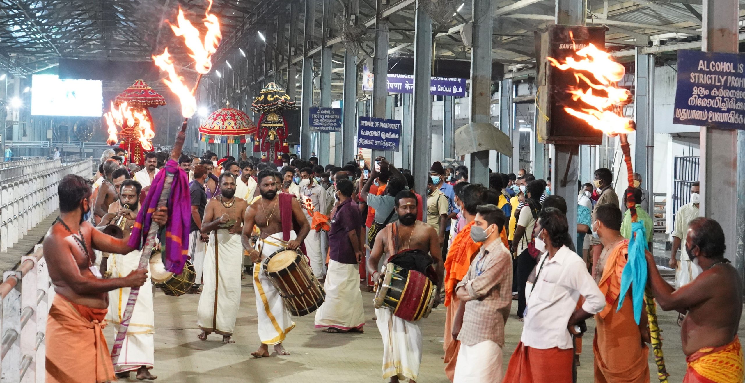 മാളികപ്പുറം മേല്ശാന്തി രജില് നീലകണ്ഠന് നമ്പൂതിരിയാണ് എഴുന്നള്ളത്തിന് ഉപയോഗിച്ച തിടമ്പ് പൂജിച്ച് കൈമാറിയത്.തിരുവാഭരണപ്പെട്ടിയോടൊപ്പം കൊണ്ടുവന്ന കൊടിപ്പെട്ടിയിലെ കൊടി, തിടമ്പ്, കുട എന്നിവയുള്പ്പെടെ വാദ്യഘോഷങ്ങളോടെ വര്ണ്ണശബളമായായിരുന്നു ശരംകുത്തിയിലേക്കുള്ള എഴുന്നള്ളത്ത്. മിക്ക വര്ഷങ്ങളിലും എഴുന്നള്ളത്തിന് ആനയുണ്ടാവാറുണ്ടെങ്കിലും ഇത്തവണയില്ലായിരുന്നു. എഴുന്നള്ളത്ത് സമാപിച്ച ശേഷം അവിടെ വച്ച് നായാട്ട് വിളിച്ചു. തുടര്ന്ന് വാദ്യമേളങ്ങളും തീവെട്ടികളും കെടുത്തിയാണ് മാളികപ്പുറത്തെ മണിമണ്ഡപത്തില് തിരിച്ചെത്തിയത്.