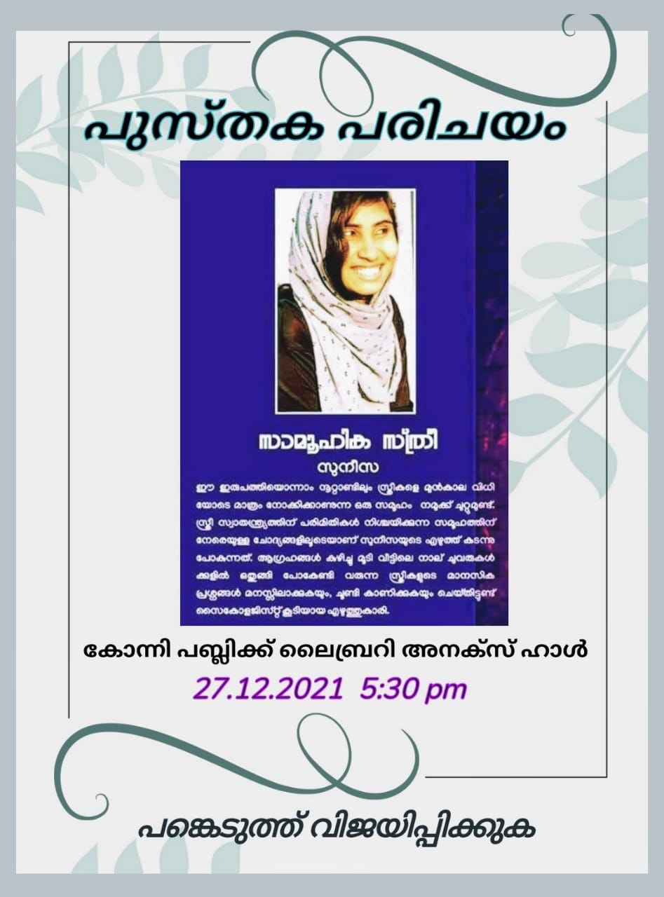 konnivartha.com : സൈക്കോളജിസ്റ്റും എഴുത്തുകാരിയുമായ കോന്നി വട്ടക്കാവ് നിവാസിയും ഇപ്പോള് ബാംഗ്ലൂരിൽ സൈക്കോളജിസ്റ്റായി ജോലി നോക്കുന്ന സുനീസ എഴുതിയ സാമൂഹിക സ്ത്രീ എന്ന പുസ്തകം കോന്നി പബ്ലിക്ക് ലൈബ്രറി അനക്സ് ഹാളിൽ 27.12.21 വൈകിട്ട് 5.30 ന് പരിചയപ്പെടുത്തുന്നു. പുസ്തക പരിചയ സദസ്സിൽ സാമൂഹ്യ സാംസ്കാരിക രാഷ്ട്രീയ നേതാക്കൾ പങ്കെടുക്കുന്നതാണ്. ഈ ഇരുപത്തിയൊന്നാം നൂറ്റാണ്ടിലും നമുക്കിടയിൽ അടിച്ചമർത്തപ്പെട്ട കഴിയേണ്ടി വരുന്ന സ്ത്രീകൾക്ക് വേണ്ടിയുള്ള ശബ്ദമാണ് സാമൂഹിക സ്ത്രീ എന്ന പുസ്തകം. സ്വയം ഒതുങ്ങി കഴിയാൻ നിർബന്ധിതയാകുകയും, സമൂഹം കല്പിച്ചു നൽകിയിരിക്കുന്ന ചട്ടക്കൂട്ടിൽ മാത്രം ജീവിതം ഒതുക്കുവാൻ പ്രേരിപ്പിക്കപ്പെടുന്ന സ്ത്രീകൾക്കും വേണ്ടിയുള്ളതാണീ പുസ്തകം. സ്വാതന്ത്ര്യം എല്ലാവര്ക്കും അവകാശപ്പെട്ടതാണെന്ന് വാദിക്കുന്നുണ്ട് എഴുത്തുകാരി പുസ്തകത്തിലൂടെ. സൈക്കോളജിസ്ട് കൂടിയായ സുനീസ, പത്തനംതിട്ട കോന്നി സ്വദേശിയാണ്. സോളോ യാത്രകൾ നടത്തുന്ന അപൂർവം മലയാളി വനിതകളിൽ ഒരാൾ കൂടിയാണെന്ന് എടുത്തു പറയേണ്ടിയിരിക്കുന്നു.