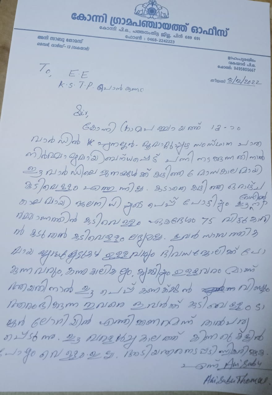 കോന്നി വാര്‍ത്ത ഡോട്ട് കോം : കെ എസ് ഡി പി എന്ന് മുതല്‍ റോഡ്‌ പണി തുടങ്ങിയോ അന്ന് മുതല്‍ കോന്നി മുതല്‍ വകയാര്‍ വരെ ഉള്ള കുടിവെള്ള പൈപ്പ് ഇളക്കി . സാധാരണ ആളുകള്‍ കുടിവെള്ളത്തിനു വേണ്ടി പരക്കം പായുന്നു .ഓഫീസുകളില്‍ വെറുതെ ഇരിക്കുന്ന ജല വിഭവ ജീവനകാര്‍ ഇത് അറിയുക .ജന പ്രതിനിധികള്‍ പരാതികള്‍ കേട്ടു മടുത്തു . കോന്നി പഞ്ചായത്ത് മെമ്പര്‍ അനി സാബു മാത്രം ഒടുവില്‍ അധികൃതര്‍ക്ക് കത്ത് നല്‍കി .